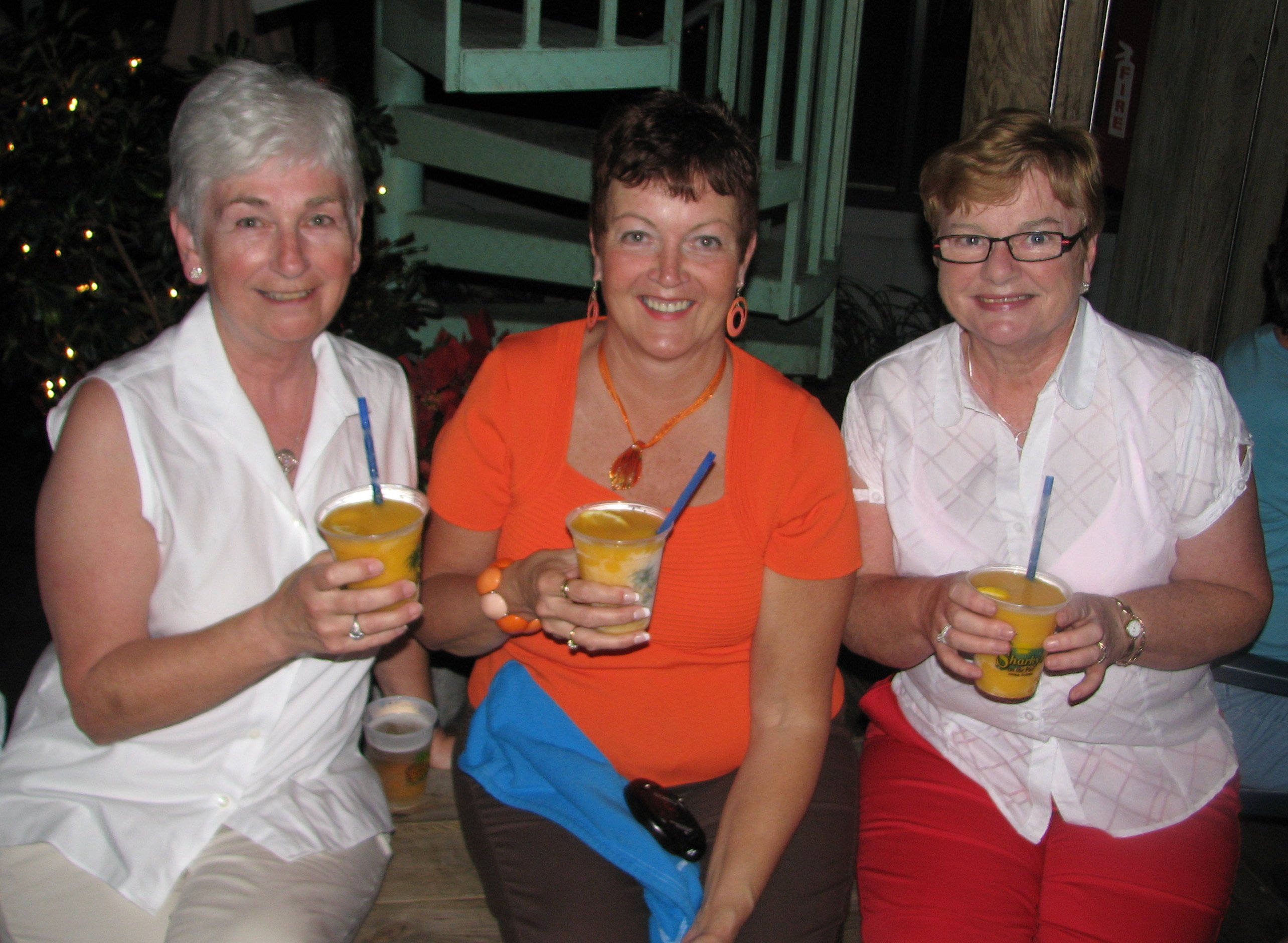 This evening we finally made it to Sharkey’s on the Pier. The weather was glorious – about 75 degrees and no wind so those of you who have been there know that it would be wonderful. While we waited for our table, we (Mary Evelyn, Carol Ann and I) enjoyed a Mango Bango – yippee!!