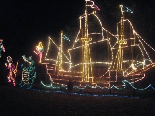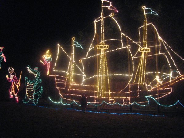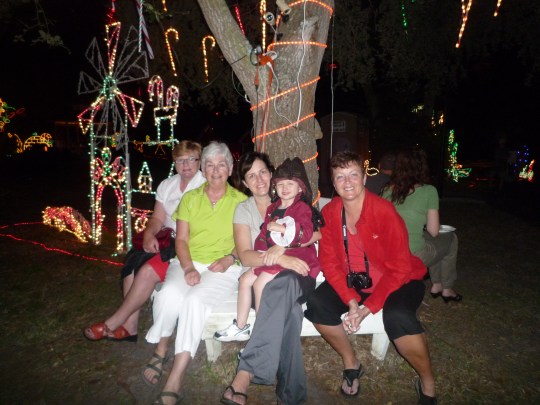 A really fascinating place to visit this time of year is a home on Mission Valley Road. It is actually an acreage where a family sets up a huge light display. The moving pieces are life-sized and contain over 180,000 lights. They are something to see. The gang (Molly, George, Gus, Mary Evelyn, Janet, Glenn, Dave, Jan, Dave, Carol and the 2 kids went). It was especially fun to see John’s reaction to it all. If you look closely, you will see that someone is standing in front of this which will give you a good idea of its size.