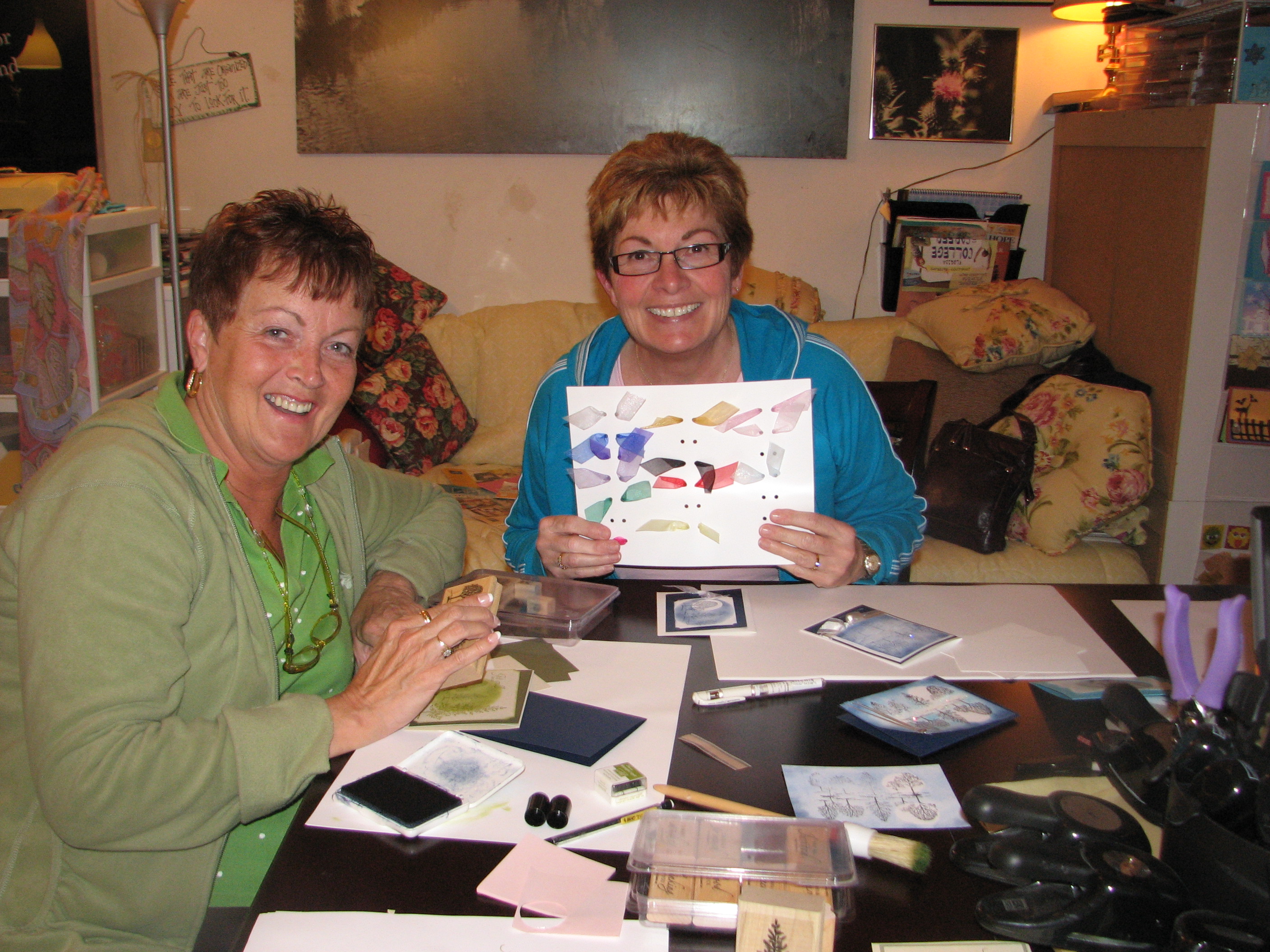 For the last 2 Tuesday evenings I have attended a Stampin Up class called Technique Tuesday. The gal, Maureen, hightlights a technique and we make 4 cards using it. This week since Mary was here she wanted to come with me to see how the process works. We had fun and she was very helpful with ideas – she certainly likes her glitter!!