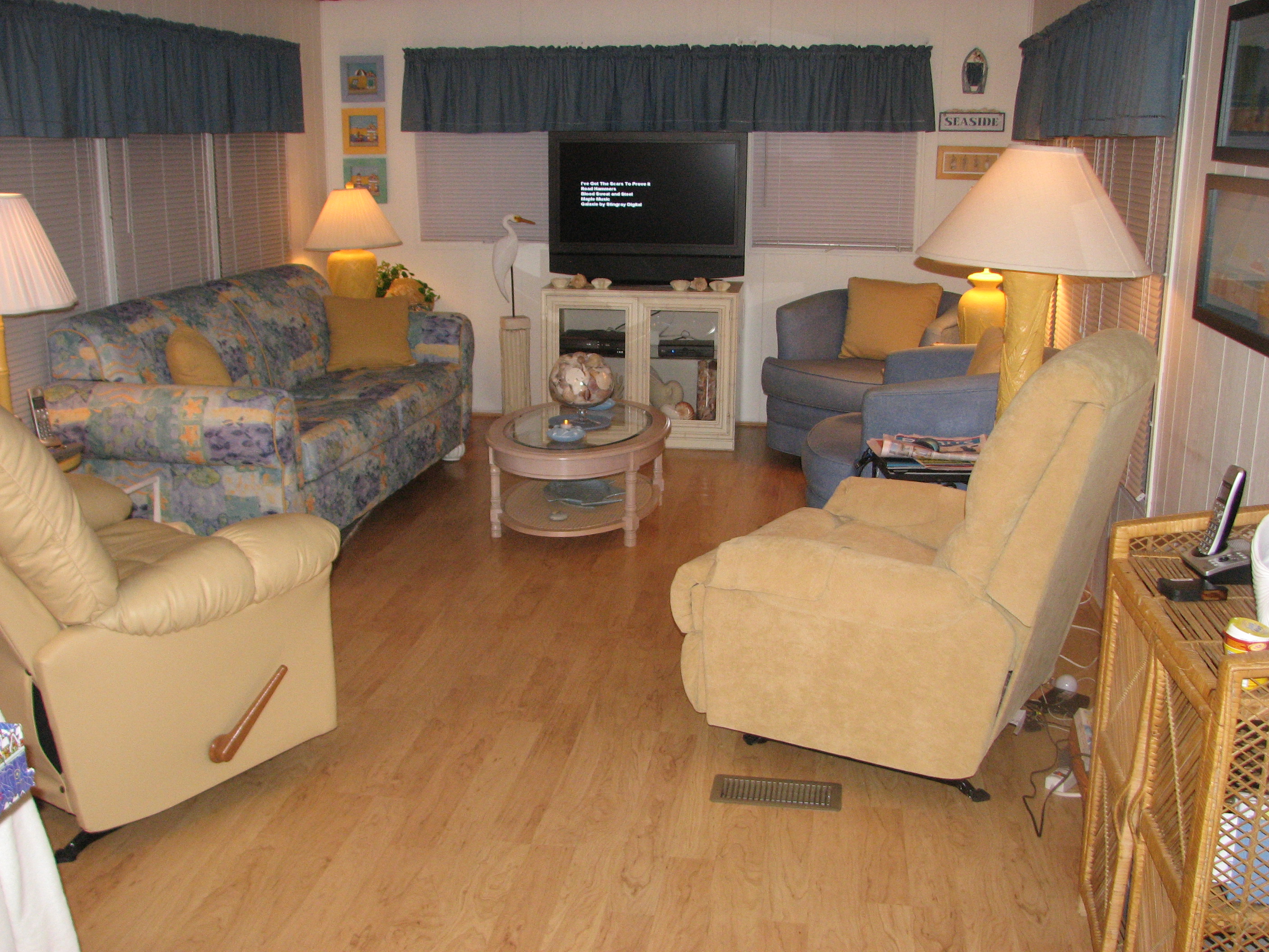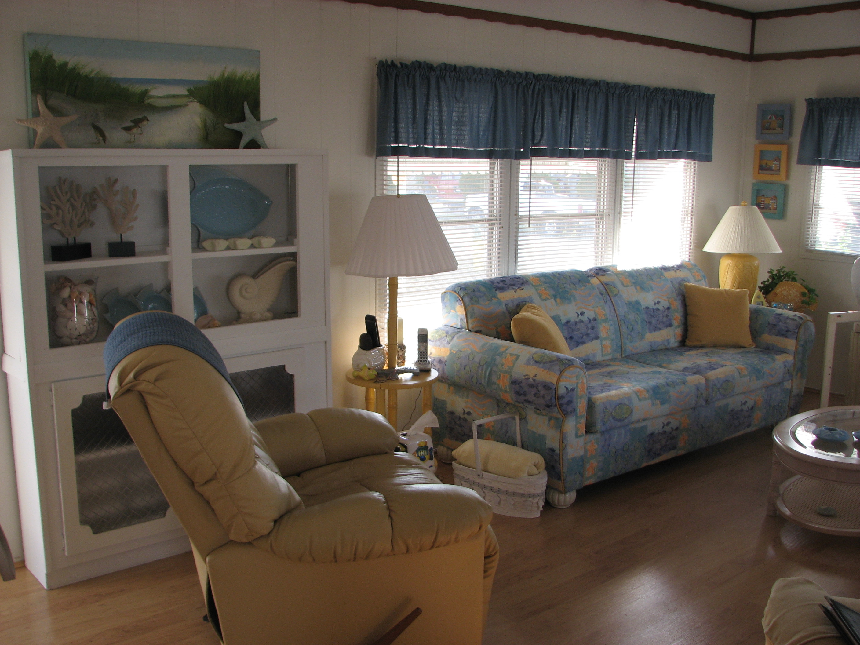 The big project was the laminate floor – it is wonderful – Dave and Dave did a super job of it and I couldn’t be happier with the finished product. It runs the length of the trailer including both the kitchen and the bathroom. It got laid quickly but the trim took a lot longer. I splurged and bought myself a rocker/recliner.