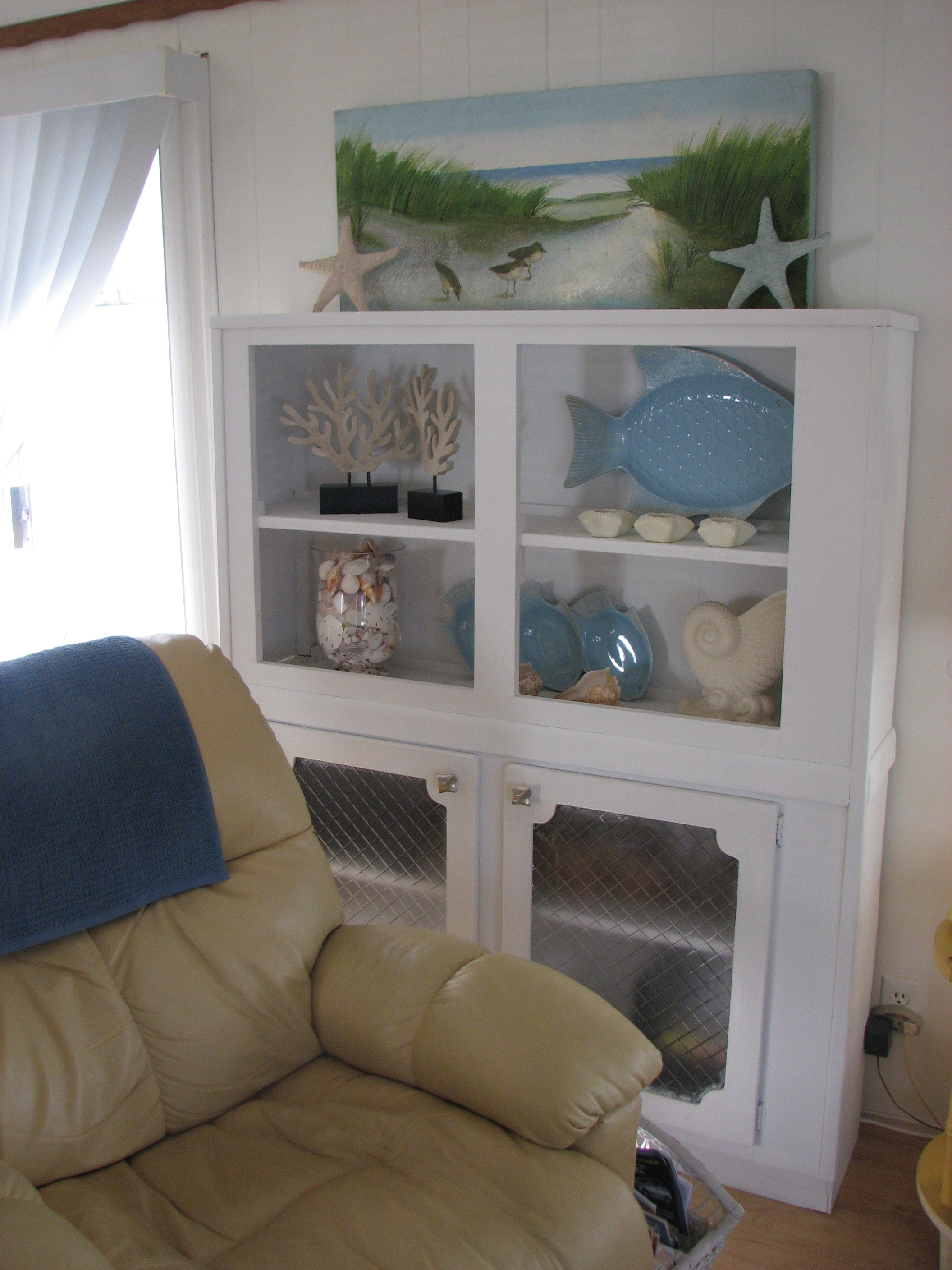 The second project was the rehab of what were originally two room dividers that separated the dining area and living area. We took them out when laying the floor and it opened up the room significantly. Dave took them, stacked them. adjusted them and painted them. Now they are a great new cabinet that is both a storage and display case. He’s getting pretty handy so I may have to keep him. (Mary Evelyn and Janet – notice the blue fish you got me on prominent display)