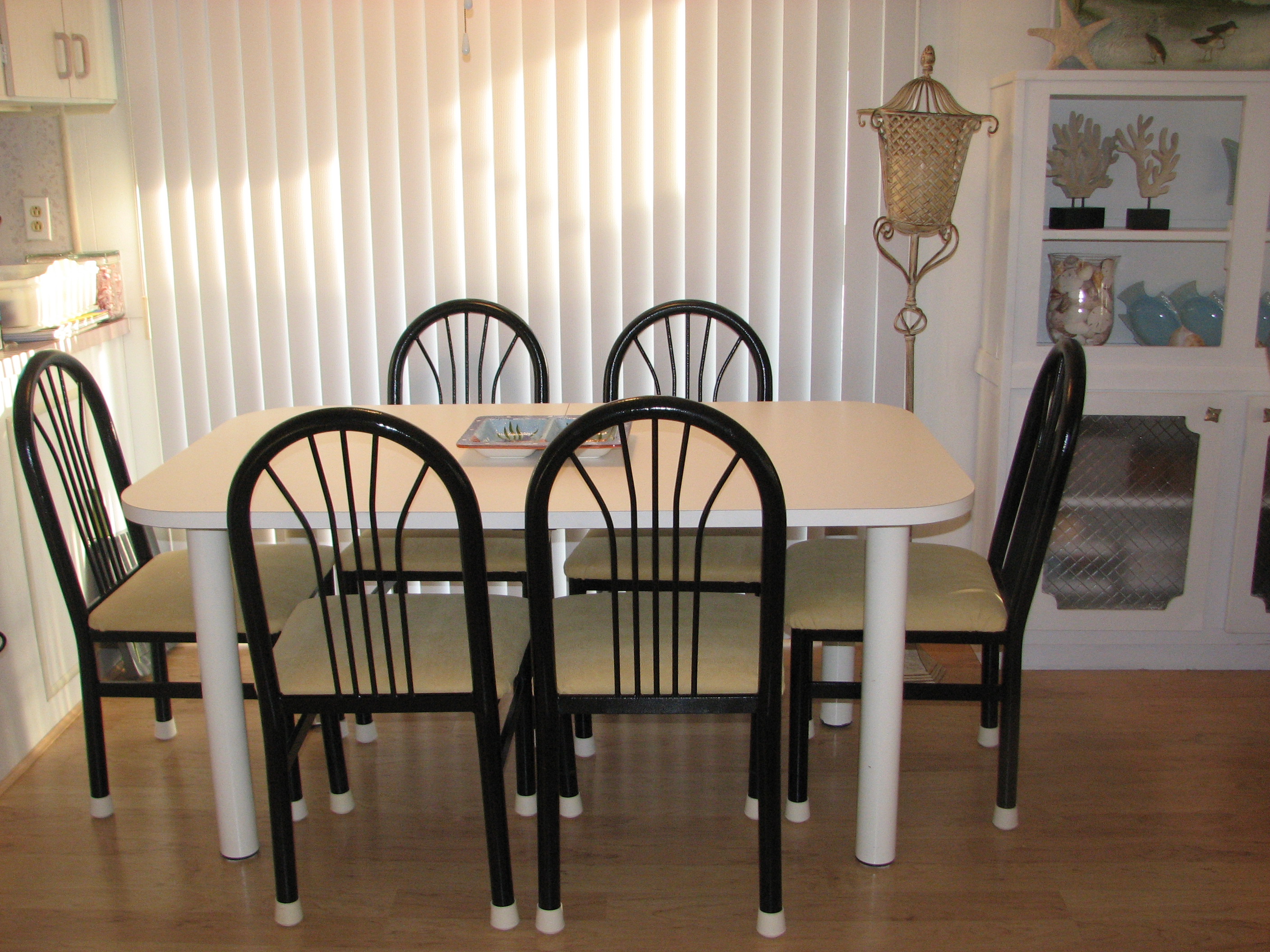 The table that came with the trailer was circa 1964 so it really had to go. I didn’t want to spend a fortune and I hoped to see one at a yard sale. There were lots of tables but many of them had glass tops and no leaf. With the large gang that is here now, it is essential that we have seating for 8 -10 for meals and more importantly dominoes. There was a 50% sale at Goodwill about a month ago and when Dave told me about it I popped over for a quick look. I found a great table (60 inches + leaf) and it was only $10. So with that I began the search for chairs. I woke up one morning and had a great idea. I had seen chairs at Habitat for Humanity (Restore) which came from a closed out McDonalds. They were $5 each. Voila! A recoat of fresh paint and new yellow suede seat covers and we are ready for the gang. I bought 8 of them and also have 2 spares that we painted black and will also recover.