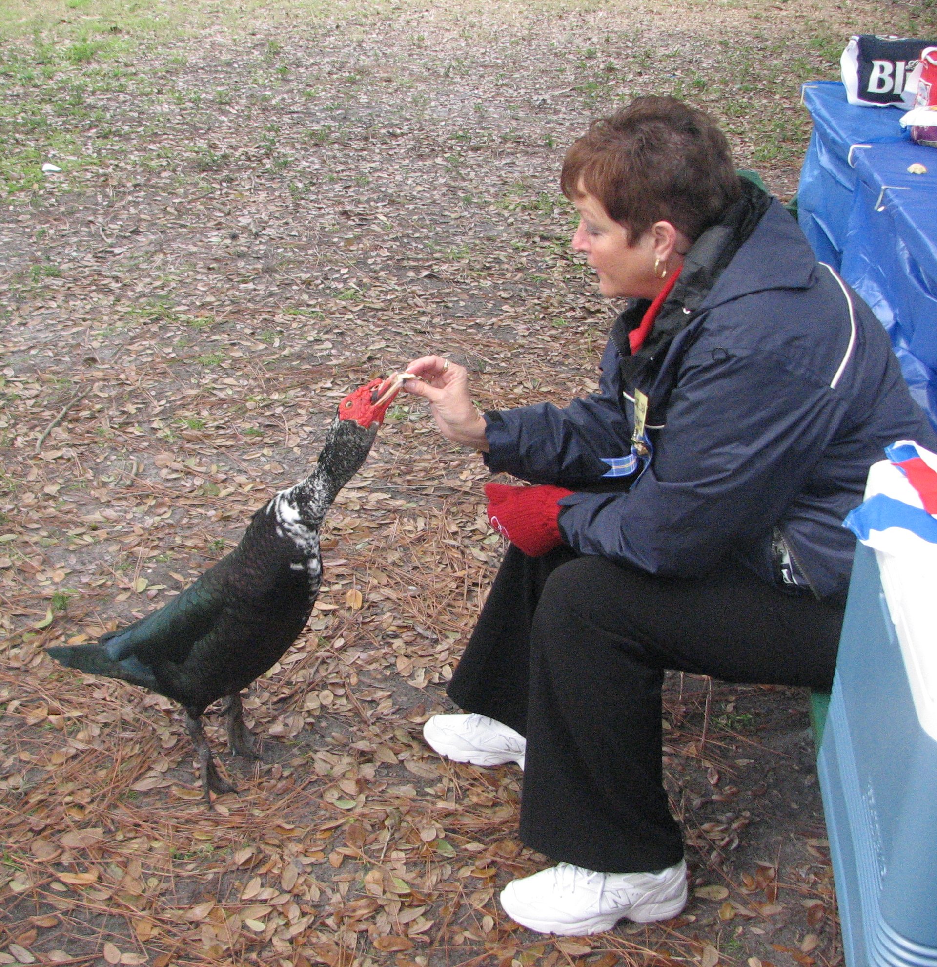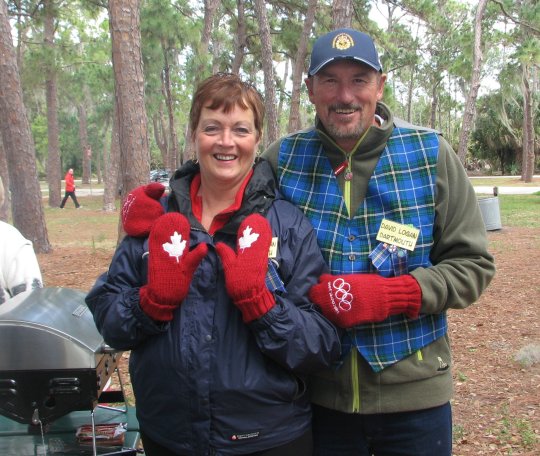 The annual Nova Scotia picnic was held on February 13th. As expected it was a very cool day so long pants were in order. I brought along the Olympic mittens that Trevor sent us and we actually wore them for warmth. Dave cooked sausages on his new portable BBQ and we managed to consume 40 with the gang who met us there. We got to spend time with Erna and Mac Leadbeater (Marion Bridge) who live in Largo, with Leah and Doug MacLean (Calgary) who live in Largo, Brenda and Cal Collins (Dartmouth) who live in Zephyrhills, as well as others we know from places near and far. Liz and Earl Corkery met us there as they arrived for their 3 and a half month stay. Although it was only 50 degrees, the sun came out and being with so many Nova Scotians is always a blast. The very ugly duck wanted to join us so I fed him a bun!!!