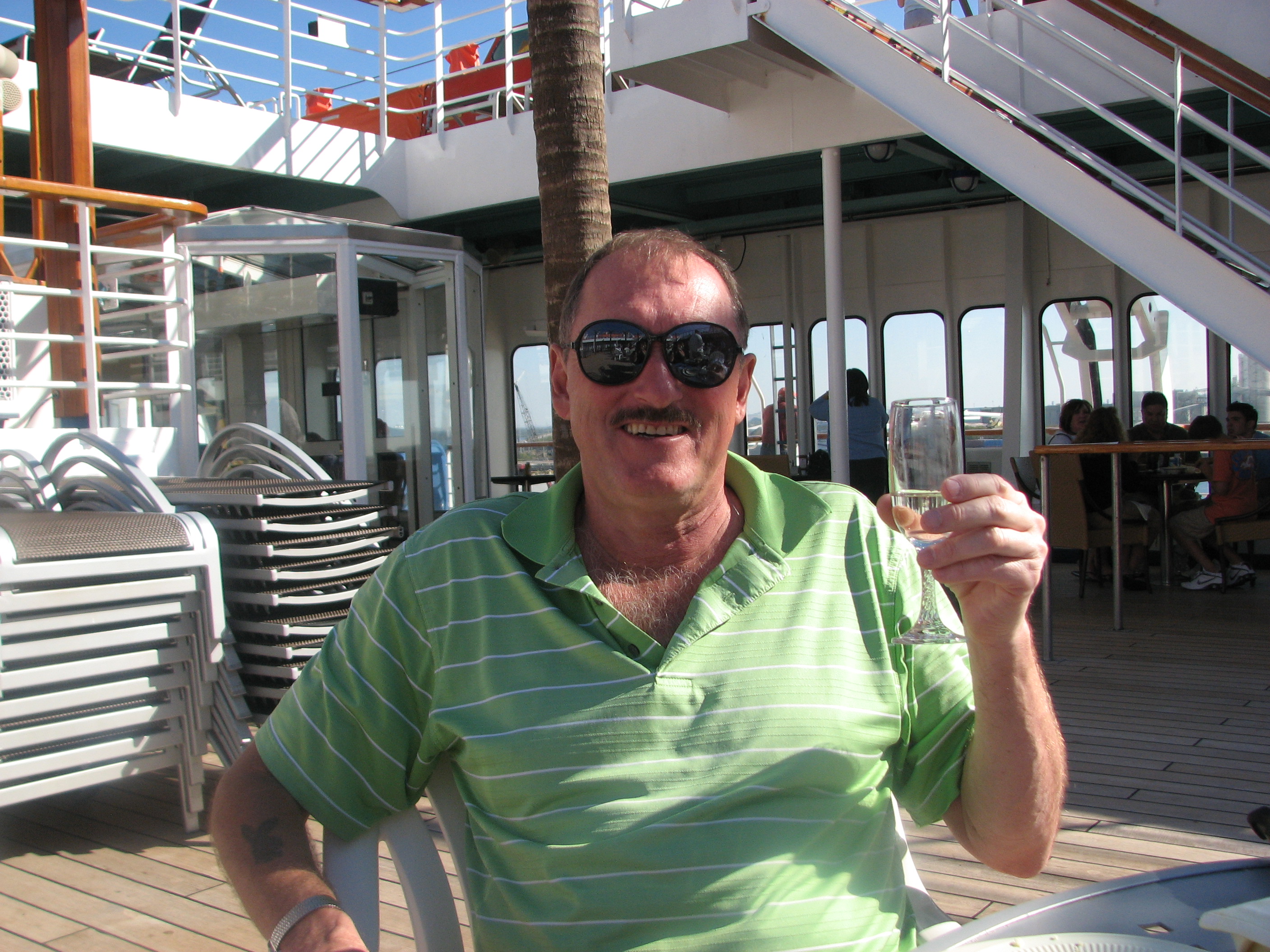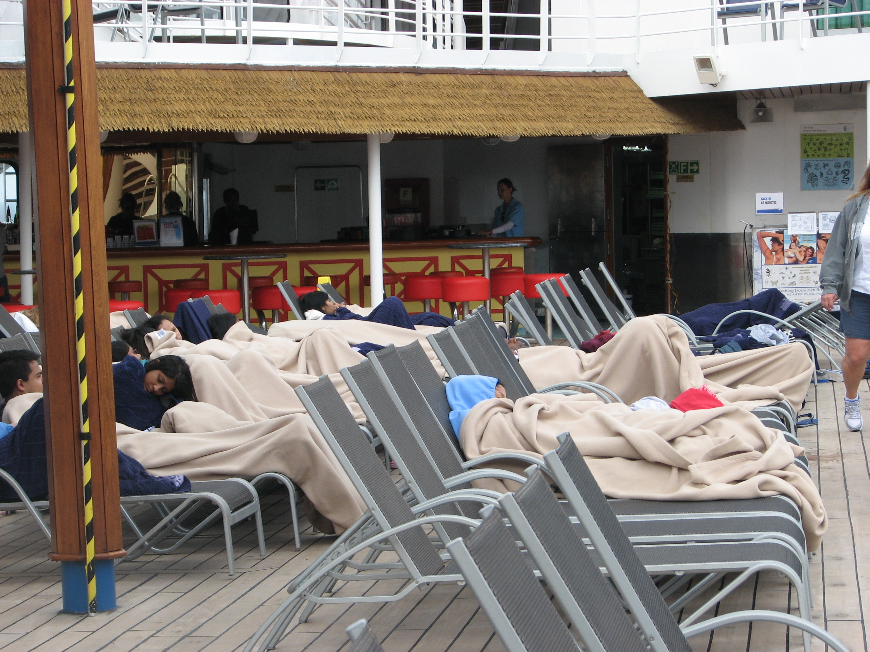 The last day of the cruise was a rough one – lots of sick people – after breakfast in the dining room I felt a little iffy so I took a gravol and had a nap. Dave watched a movie and then when I got up I managed to go to the Lido deck for lunch. The lounge chairs were filled with blanket wrapped folk – reminiscent of a refugee boat LOL!!! I managed to hold my own – spurred on by sailor Dave who had lots of advice for walking without falling. I did however look drunk as did most everyone. The evening show was cancelled as the dancers just could not have managed at all. We had dinner and then packed and put the suitcases outside the door. Before bed we met Diane and Dan for a last night drink.