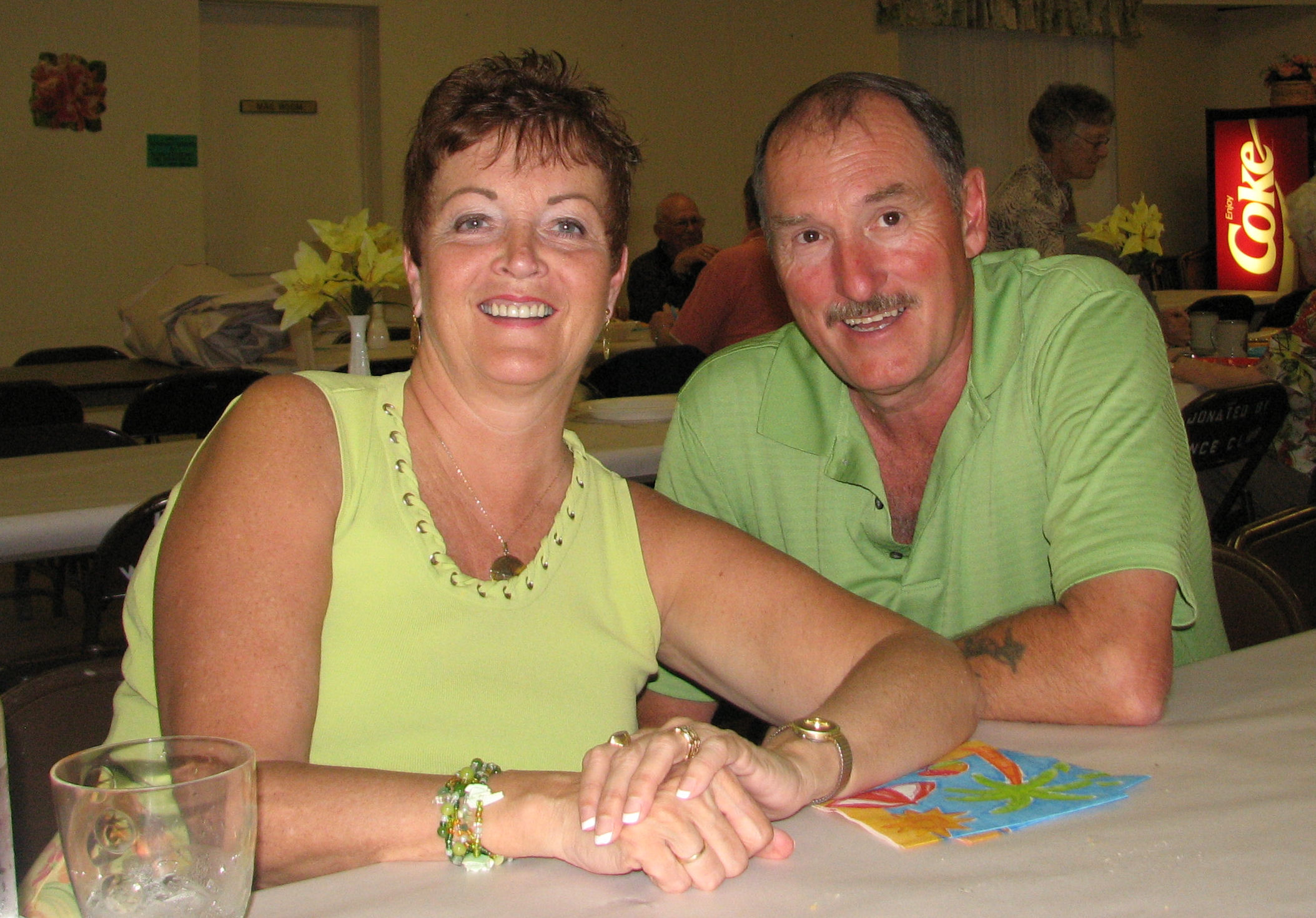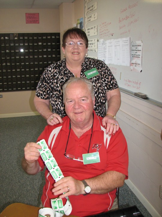 Peg and Jim at the Welcome Back Potluck (selling the 50/50 tickets)