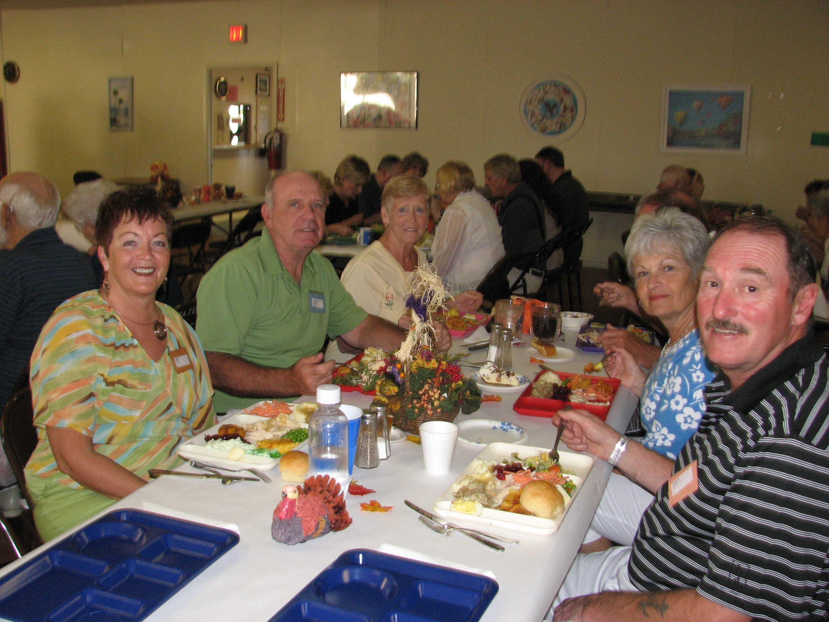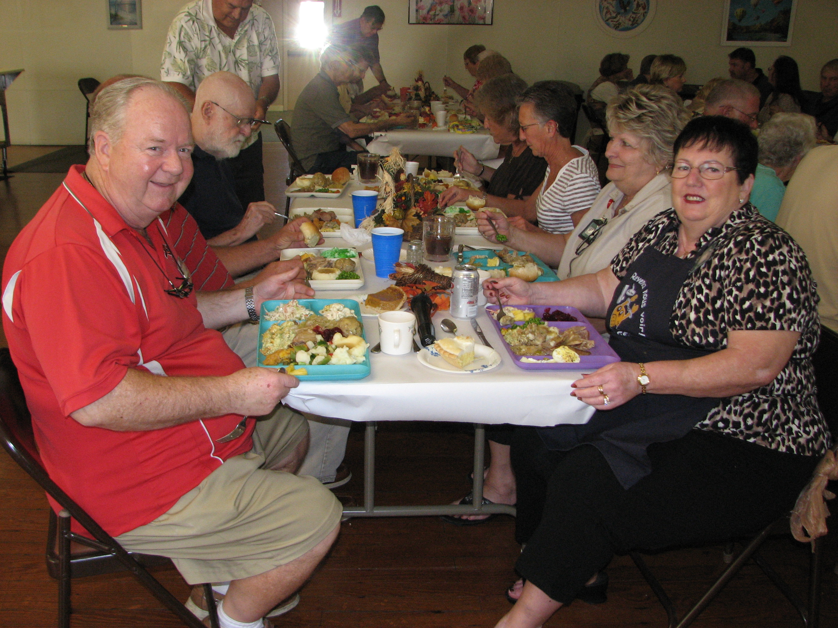 Well today was “turkey day” here in the United States! It was a hot and sunny day but we trekked off to the clubhouse for the noon dinner. Jimmy Laidlaw and a team were responsible for cooking 4 turkeys and making stuffing, potatoes and gravy for the 65 attendees. We each brought a dessert, salad or side dish so there was more than enough food to pile on the famous plastic divided trays. My only lament was the fact that there are no leftovers in my fridge. A great day was had by all.