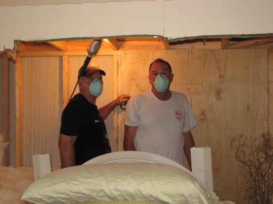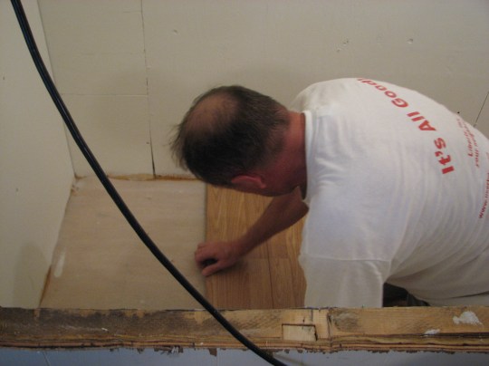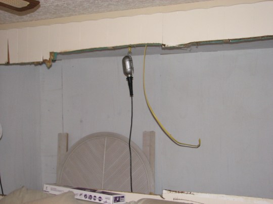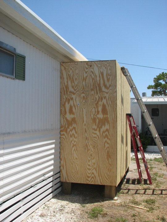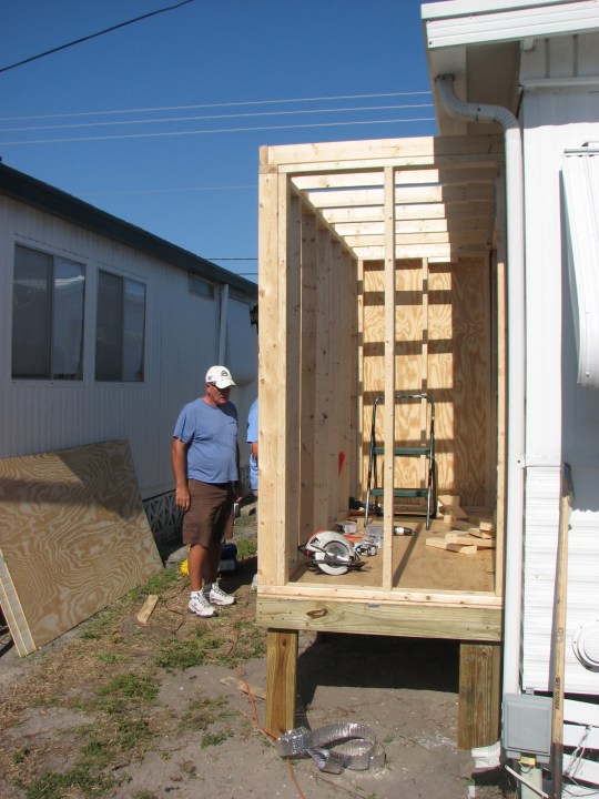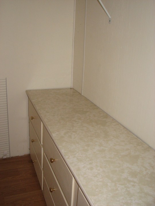 Last May Dave began building me a closet. He added it to the side of the trailer and then sealed it up for the summer. When we arrived this fall, he cut a hole in the bedroom wall and got ready to finish the closet. After a stop period while the Daniels’ were here, he began work on it again. It will be a 9 x 3 foot space that will house the former built in cabinet from the bedroom as well as a 9 foot long clothing rail. Since we removed the window, there is a large hole in the bedroom wall – necessitating a remodel of the bedroom – yipee. As of today the closet has the laminate floor, the built-in bureau, a 9 foot wire clothes rail and is painted out.