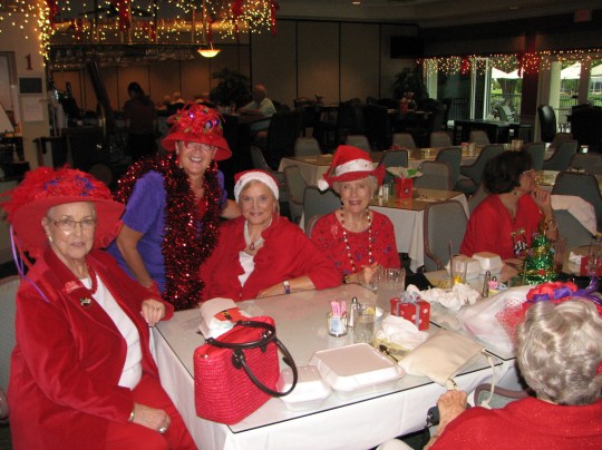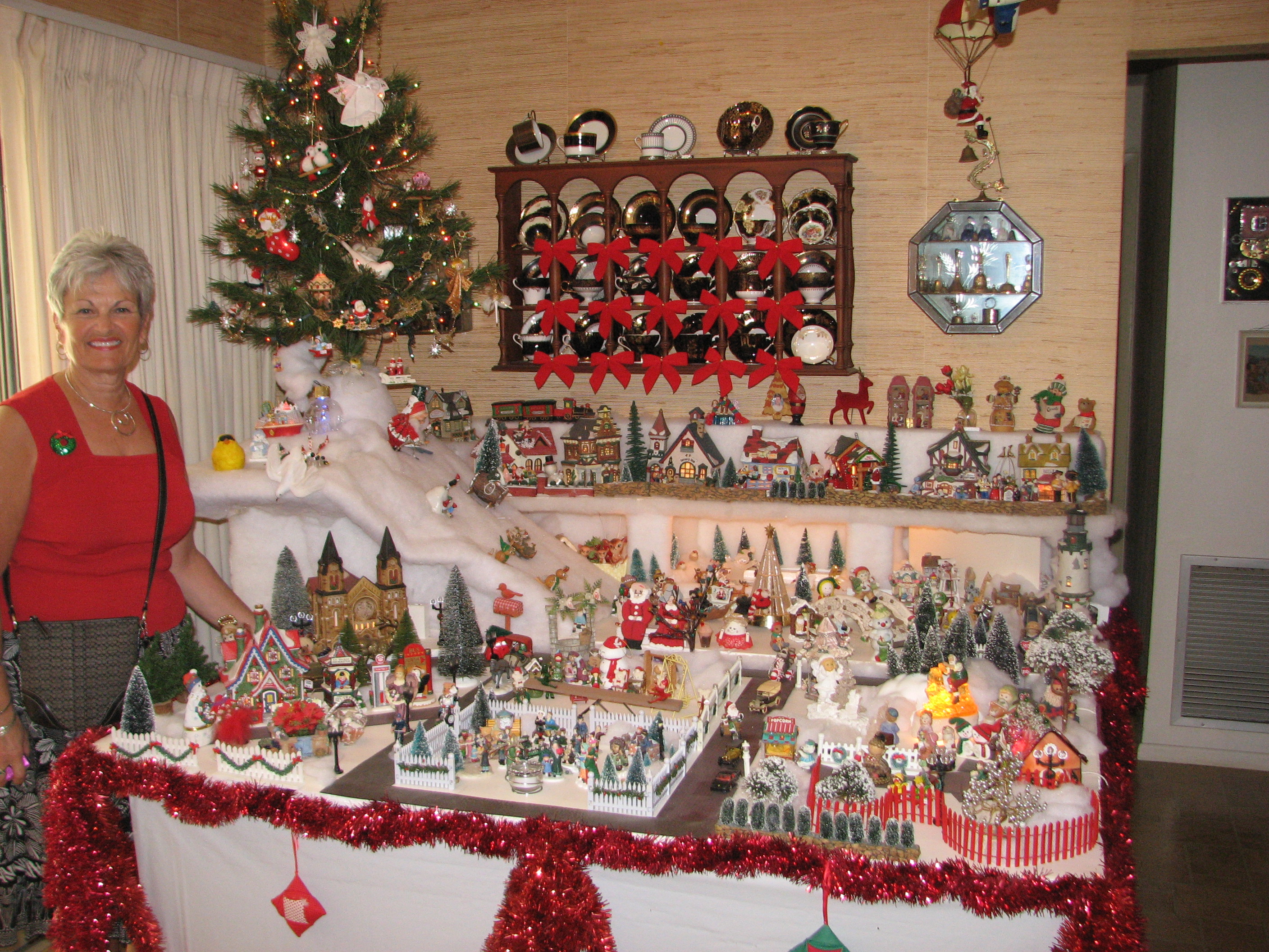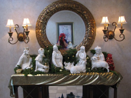 During the month I was able to attend 2 Christmas Parties hosted by the two Red Hat groups to which I belong. Liz and I spent several hours at Ginny’s house for the Queen Ann luncheon. I had been there before but she hadn’t. Ginny is 94 and her house has been featured on the local TV station as it is totally decorated for Christmas. There is so much to see that it would take hours to look at each item. She even has floating items in her pool. Just one wall of her living room had 300 of the Hallmark Card type ornamanents. It is amazing that this lady sets up this display every year and is still keen to do so at her age. This week I attended the Red Hat Flappers lunch at the Jacaranda Golf and Country Club. One of the highlights of eating there is free valet parking! The nativity set in the lobby is stunning so this year I remembered to take a picture.