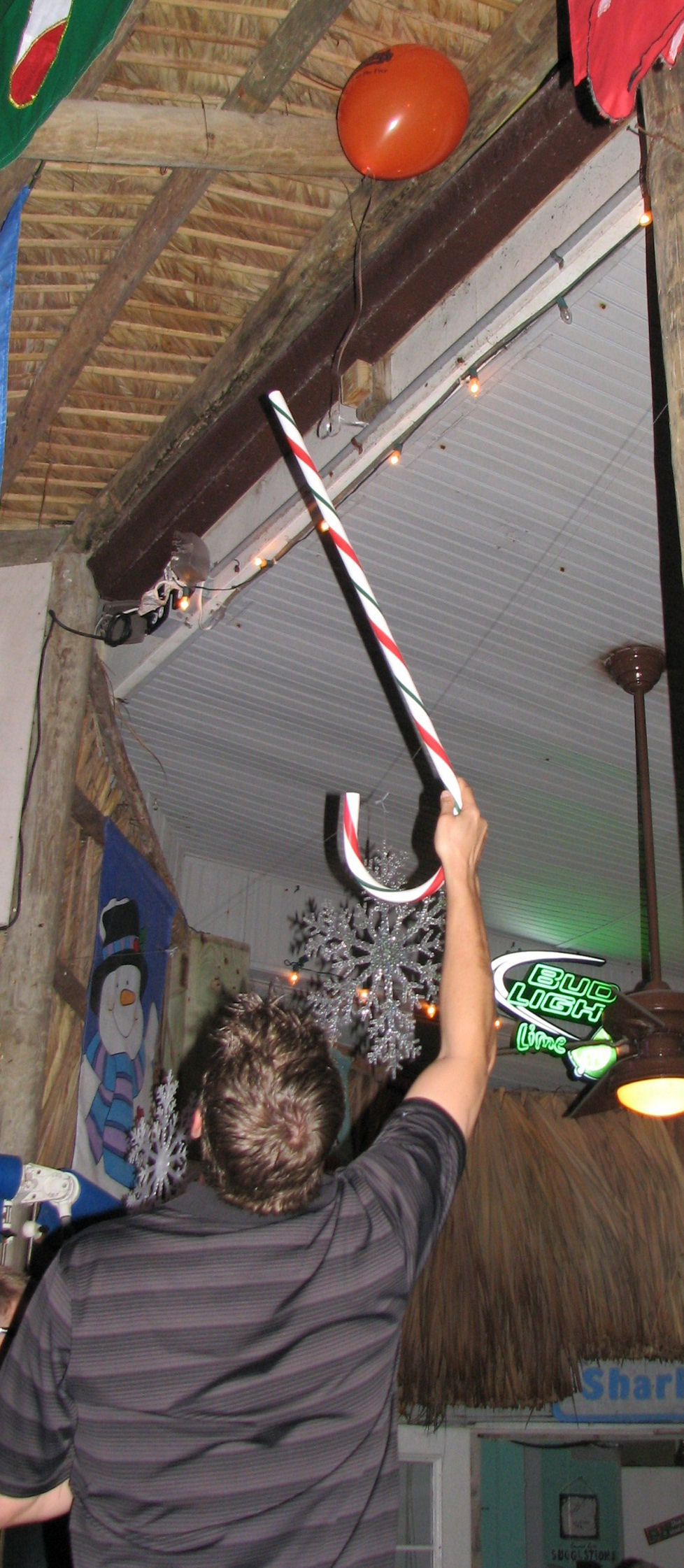 As we were hosting the MacIntyre/Cluett clan for Christmas dinner – we had to make a few “adjustments” to our calendar. Janet, Glen and Justin are flying home on December 26th so to facilitate some sanity Christmas Eve and Christmas Day were moved a day earlier. We spent an hour with them at Sharkey’s where I enjoyed my second mango bango of the season. John and Justin received balloons which proved to be lots of fun until one after the other they drifted to the ceiling. Glen got some practice with a long decorative candy cane that he used to snare the balloons and bring them to earth.