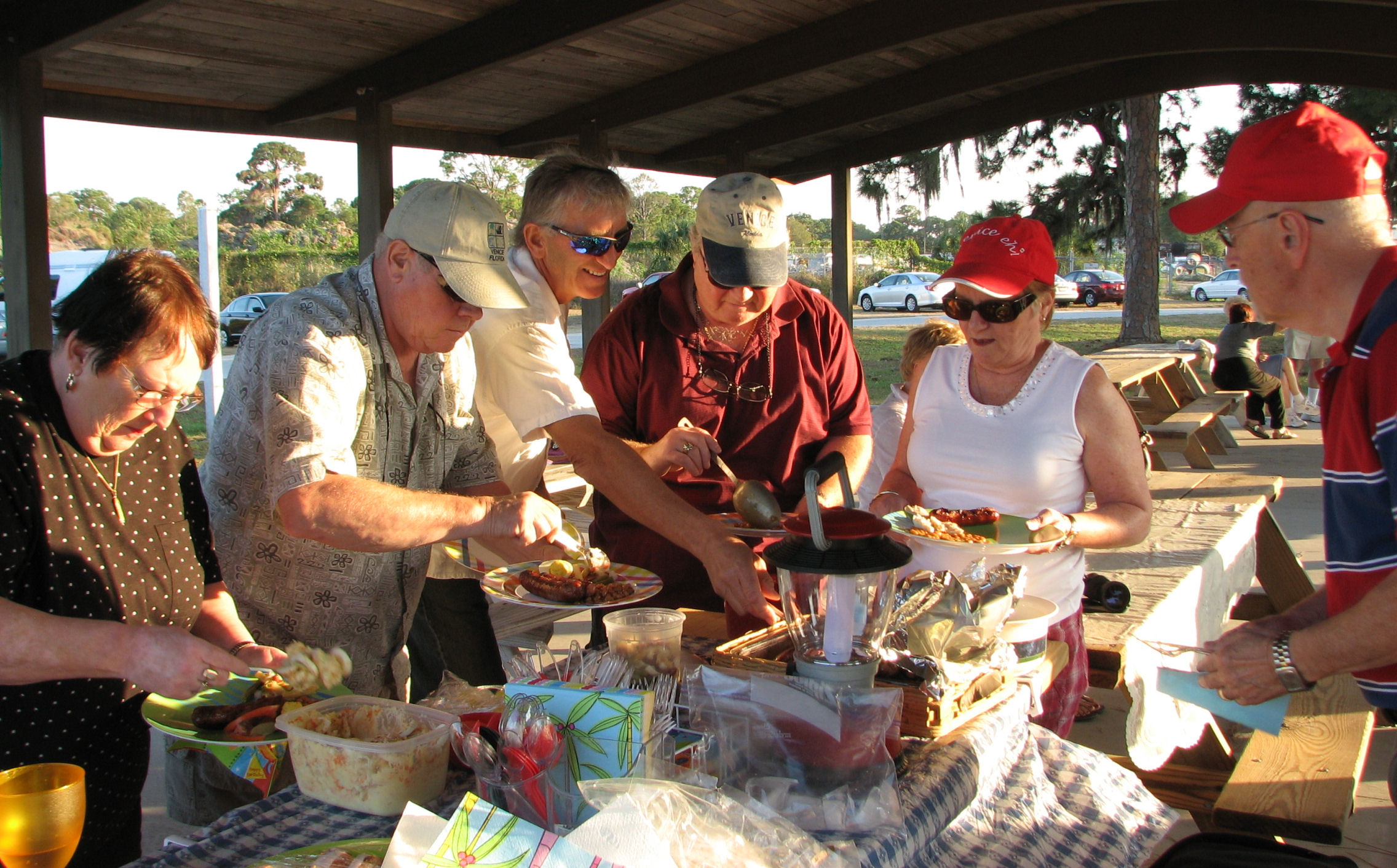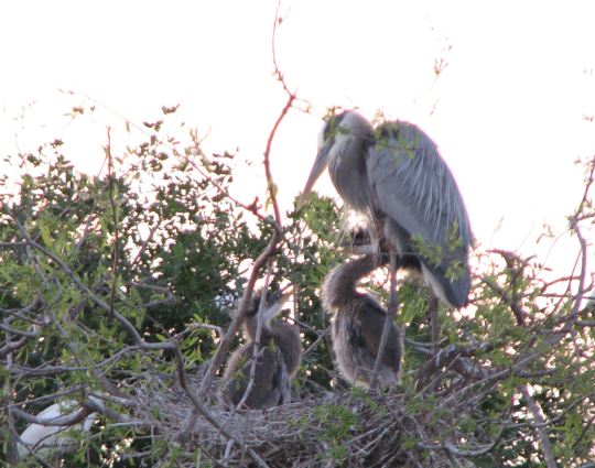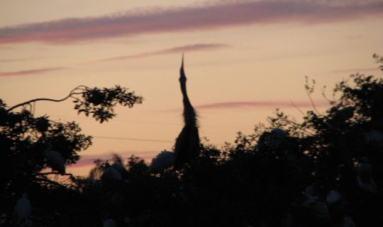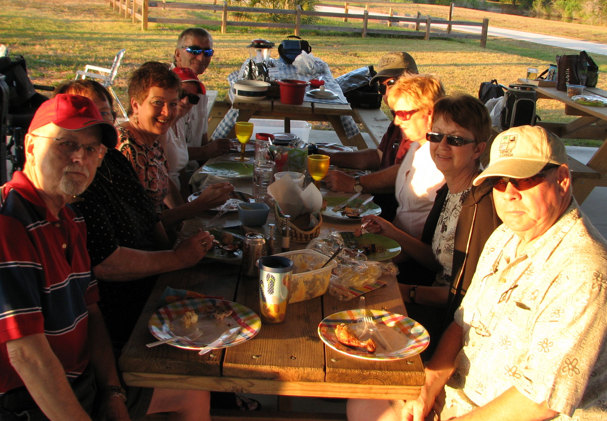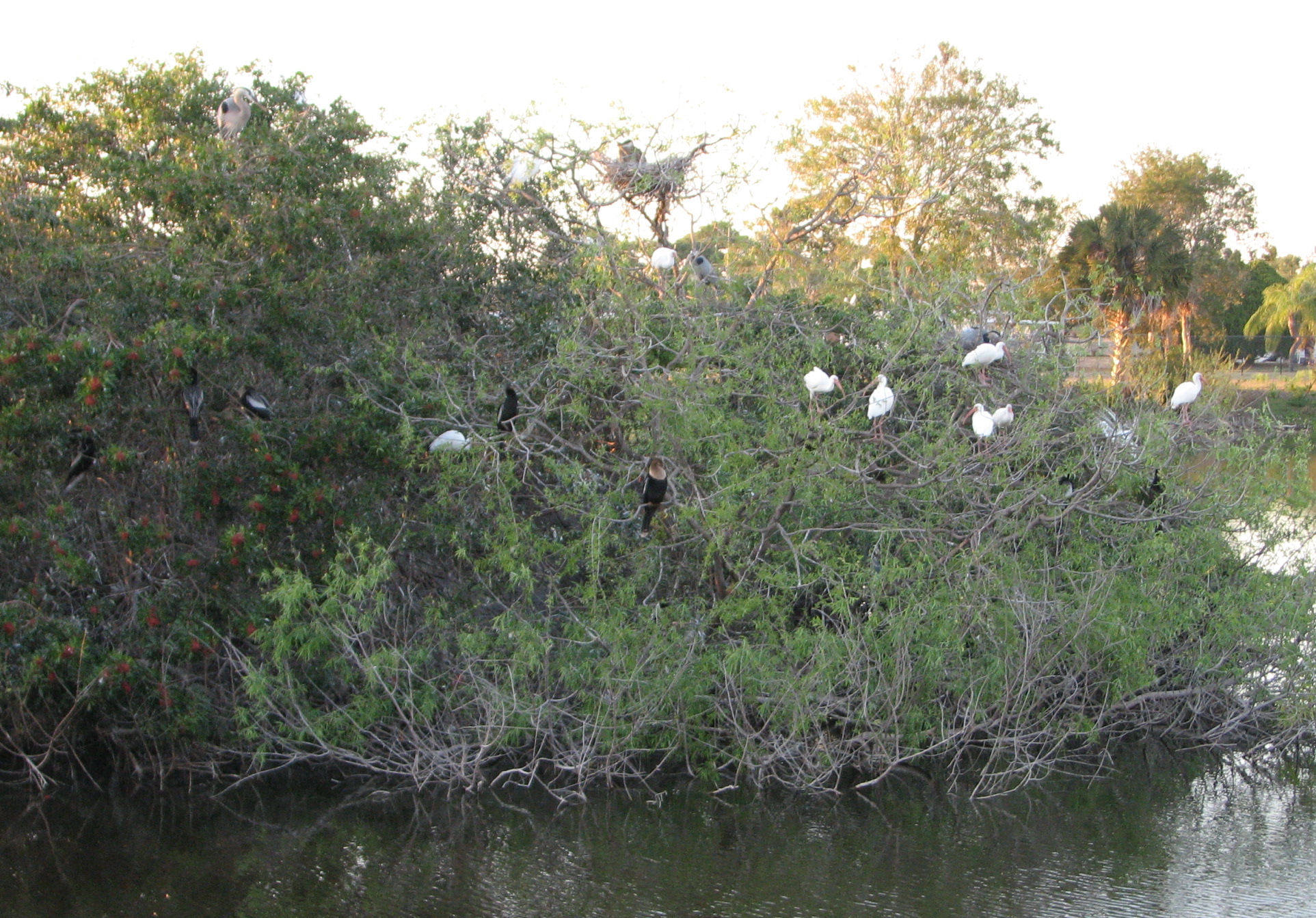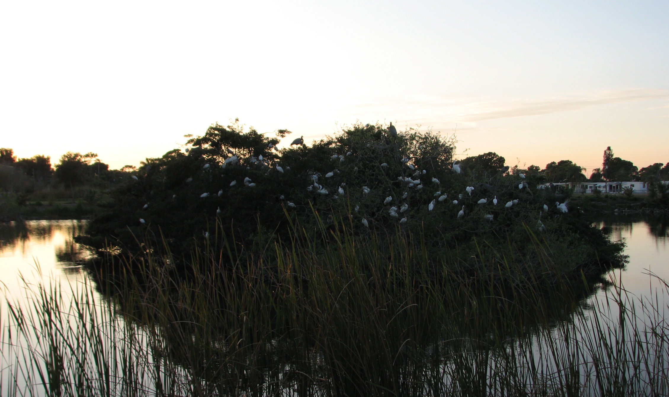 The VAAS Rookery is one of Venice, Florida’s best kept secrets. Those who discover this treasure understand the reason why. Photographers and birders from near and far come to the rookery to enjoy and photograph nesting birds during January, February and March. Although these months are the busiest time of the year, the rookery has visitors all year around. The rookery is on a small island in a very small lake. Even at that, during nesting time it is quite crowded with Great Blue Heron and Great Egrets and some Anhingas and Night Herons. Our little gang (Laidaws, Cullens, Munroes, Gallants and Logans) visited here tonight and were amazed at the activity as hundreds of birds made their way into the rookery. We arrived at 5PM and there was a steady arrival of birds. The white ones show up best but there were as many black and gray ones which you can’t see in the dim light of dusk. Of course we had to made a real adventure of it and had a picnic supper.