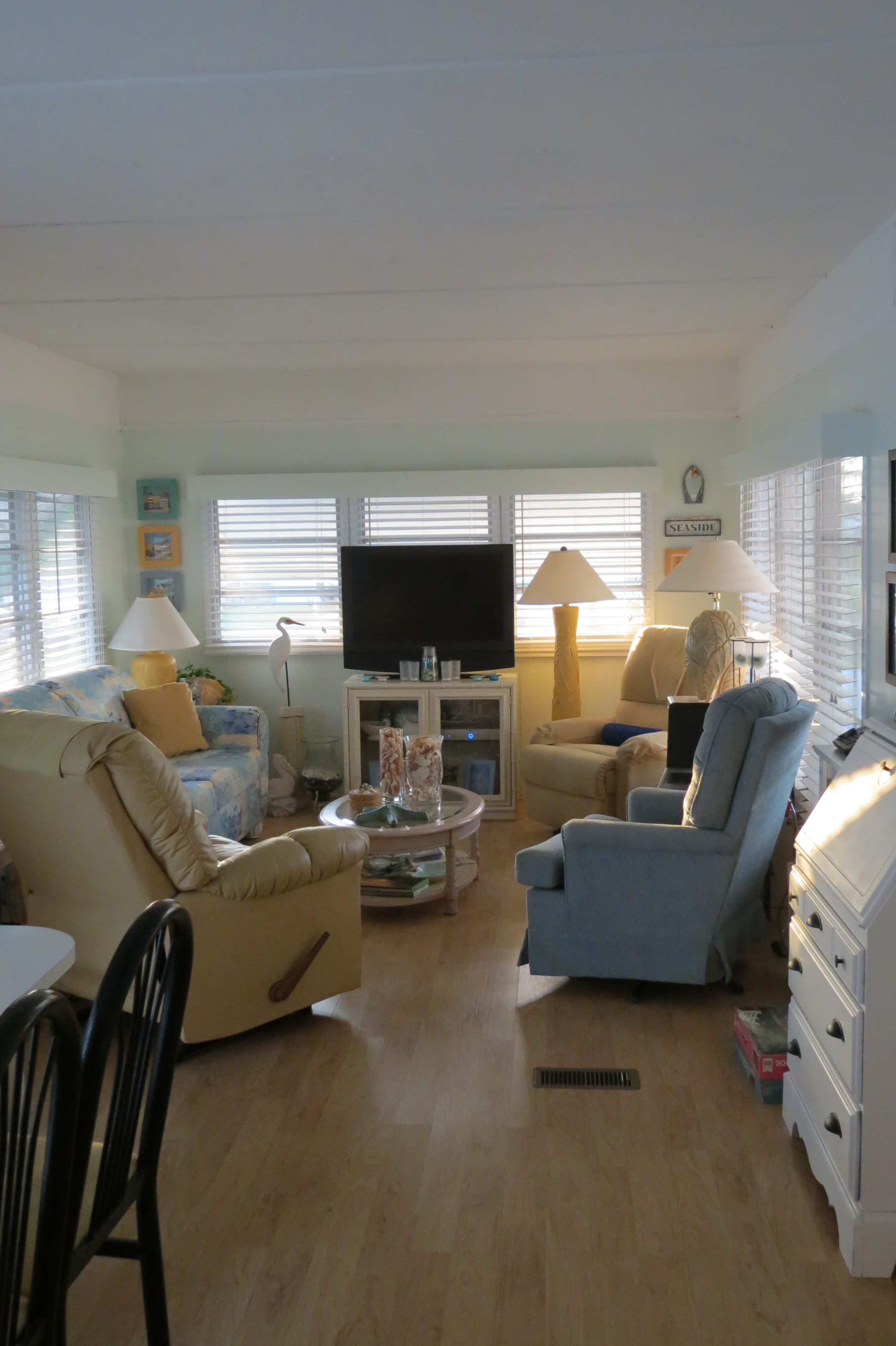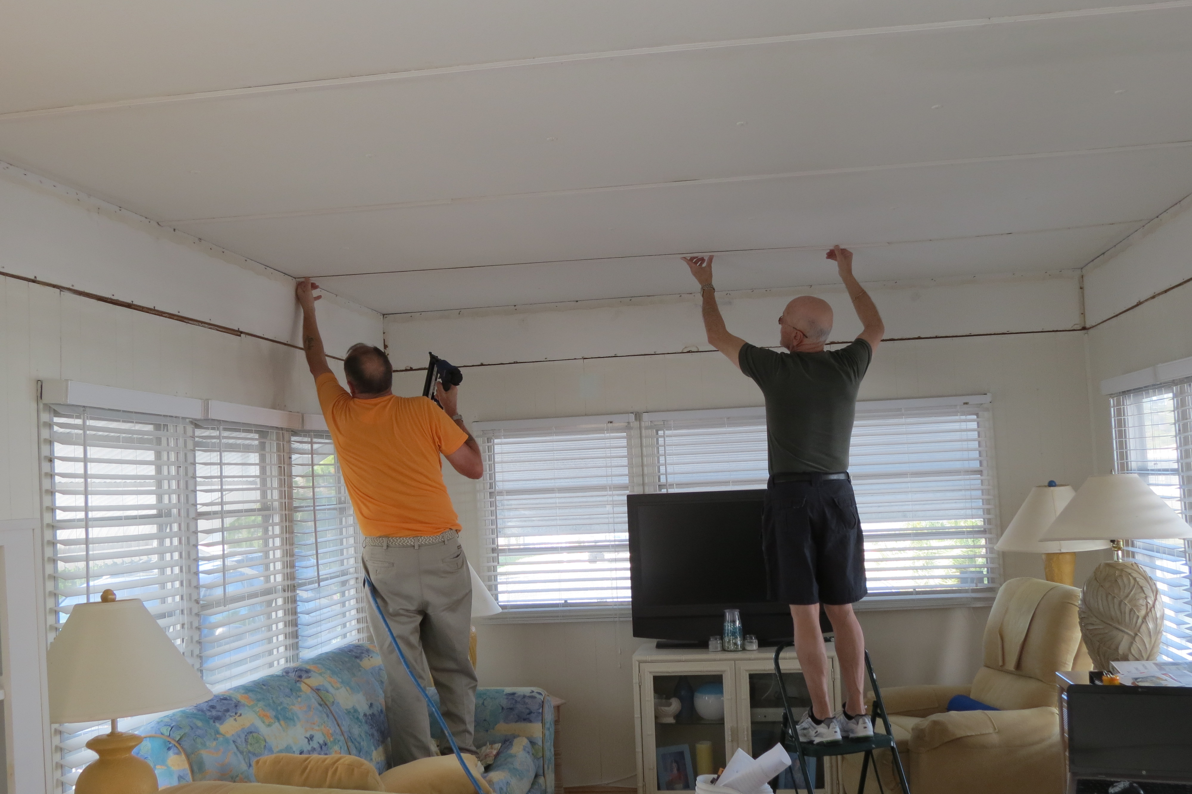 As usual it is necessary to remodel these old trailers. This winter’s reno is actually starting with the removal of some strapping and then painting the living room. The ceiling had woodgrain cross straps and scallop edged trim at the roof line and also 1 foot down. I have wanted to get rid of them or paint them for quite some time. So this was the time !