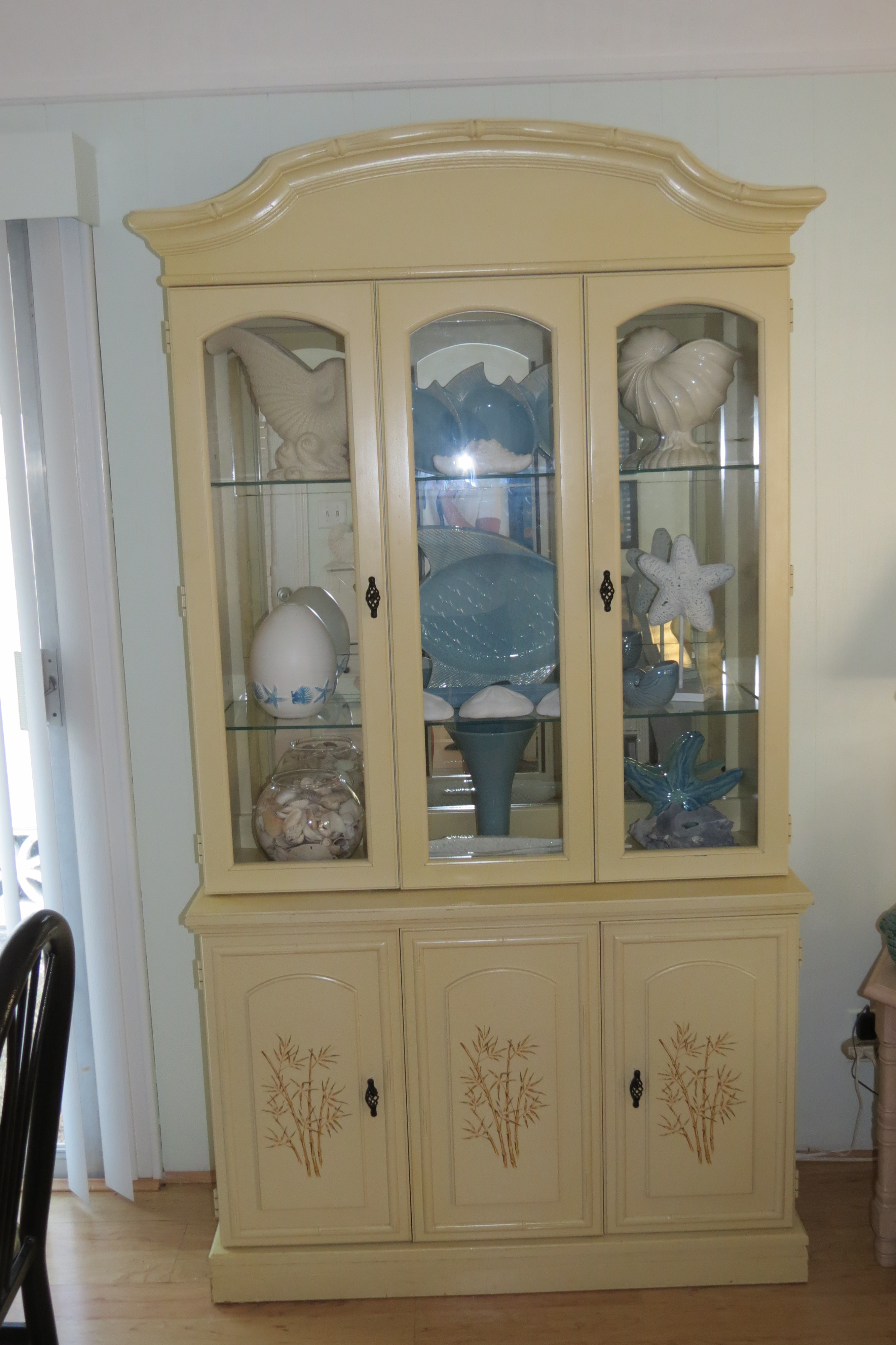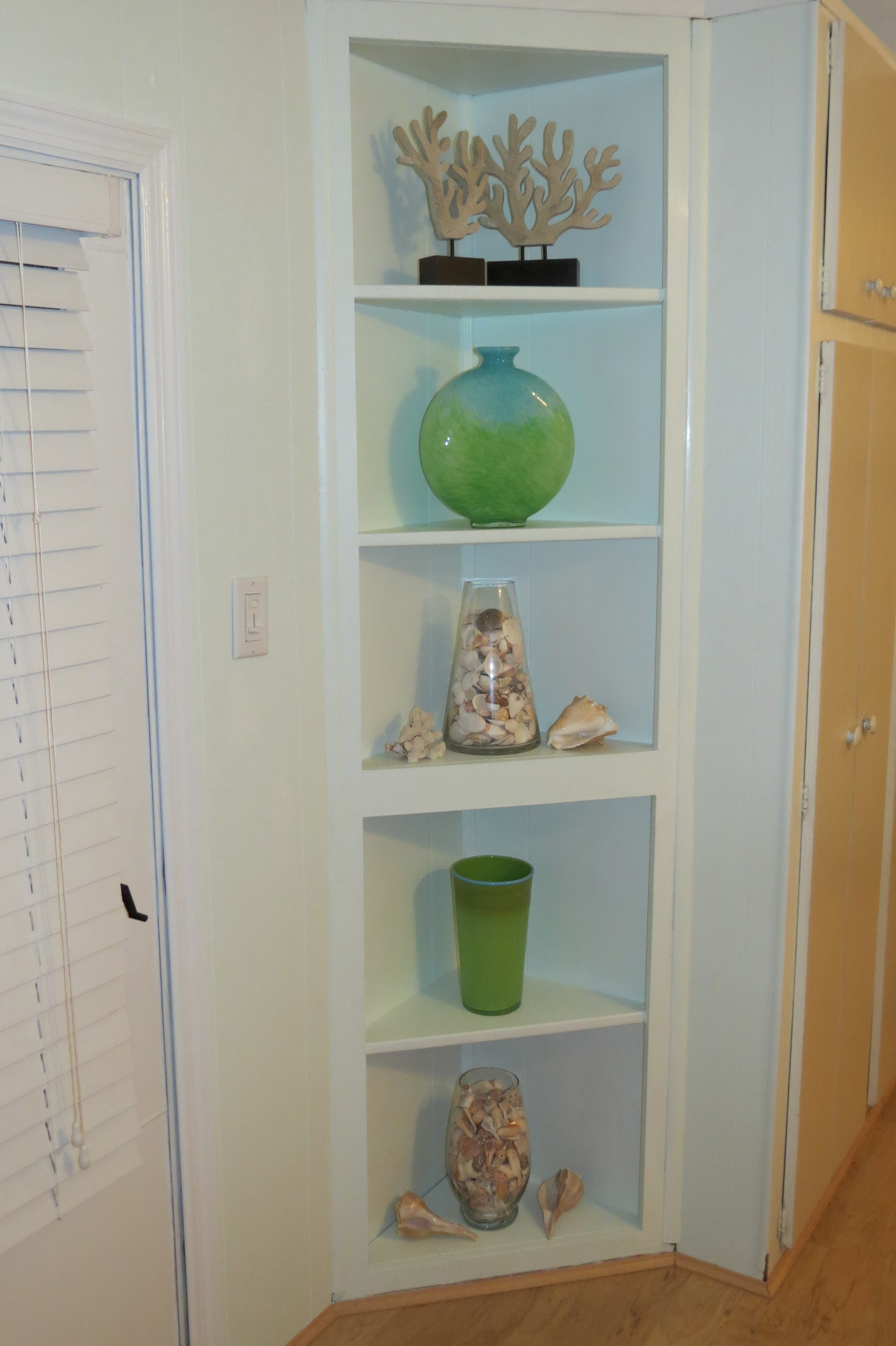 While I was painting the corner cabinet, I realized that it looked great without its doors so now it is a great corner display case – gone are the dated doors.