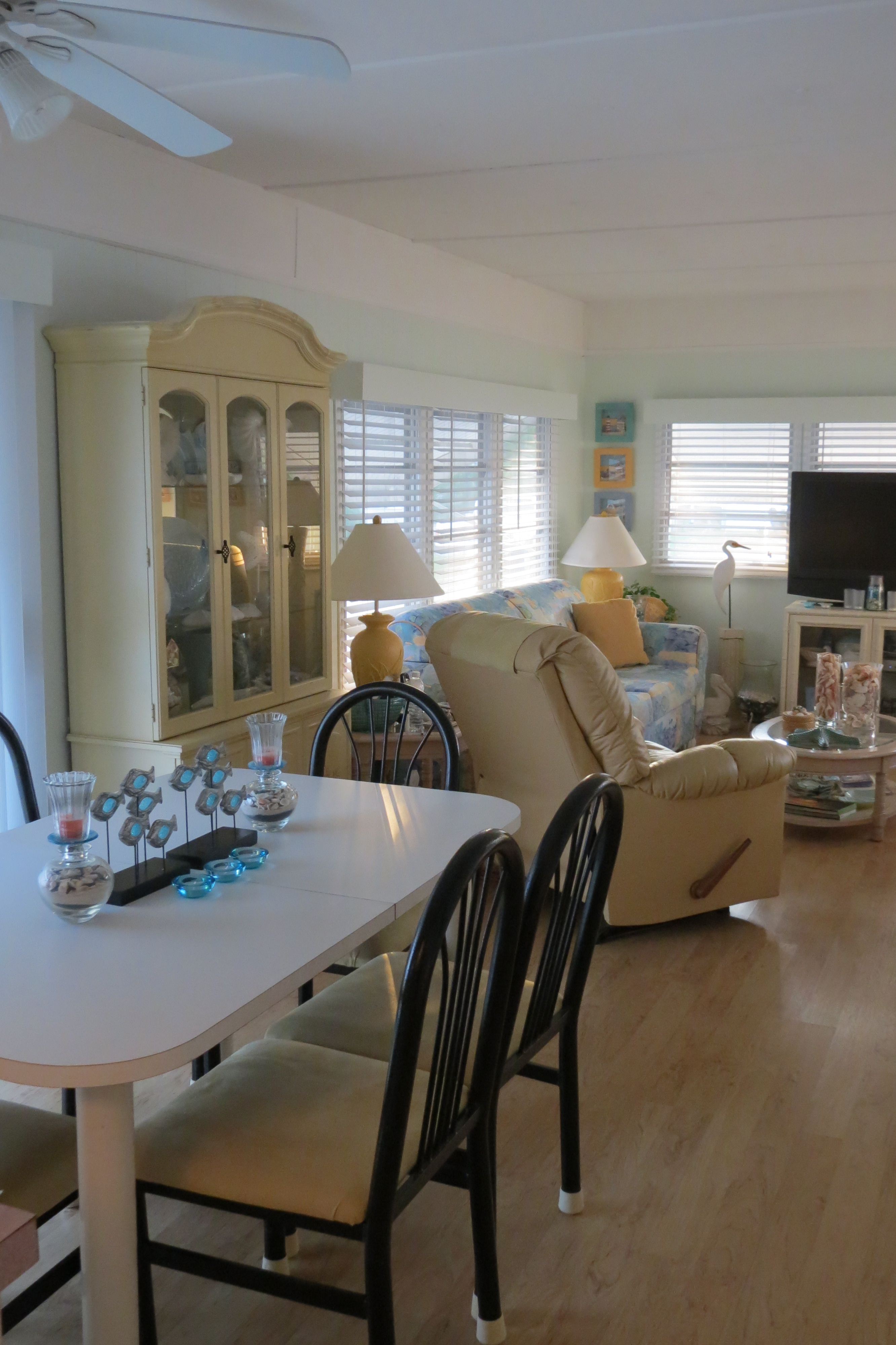 Then while my decorating brain was in gear I decided that the cabinet on the long wall didn’t look very good anymore – it was a makeshift one made from pieces that used to be the divider between the living and dining room. I knew that I would be able to find a buffet/hutch but even I was a little surprised at how quickly I found the perfect piece! We headed for supper at N’Tinos and while Earl and Dave ordered pizza, Liz and I popped into Goodwill and there it was – a buffet/hutch – for a mere $70. PERFECT TOO!