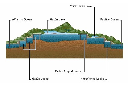 The Panama Canal is a 77.1 km (48-mile) -long canal bisecting the Isthmus of Panama. It connects the Pacific Ocean with the Caribbean Sea. There are locks at each end to lift ships up to Gatun Lake, an artificial lake created to reduce the amount of excavation work required for the canal, 26 metres (85 ft) above sea level. The current locks are 33.5 metres (110 ft) wide. A third, wider lane of locks is currently under construction and is due to open in 2015. Ships taking this canal can avoid the long journey that was once necessary for getting from one side of the Americas to the other — a route that went all the way around the southern tip of South America.