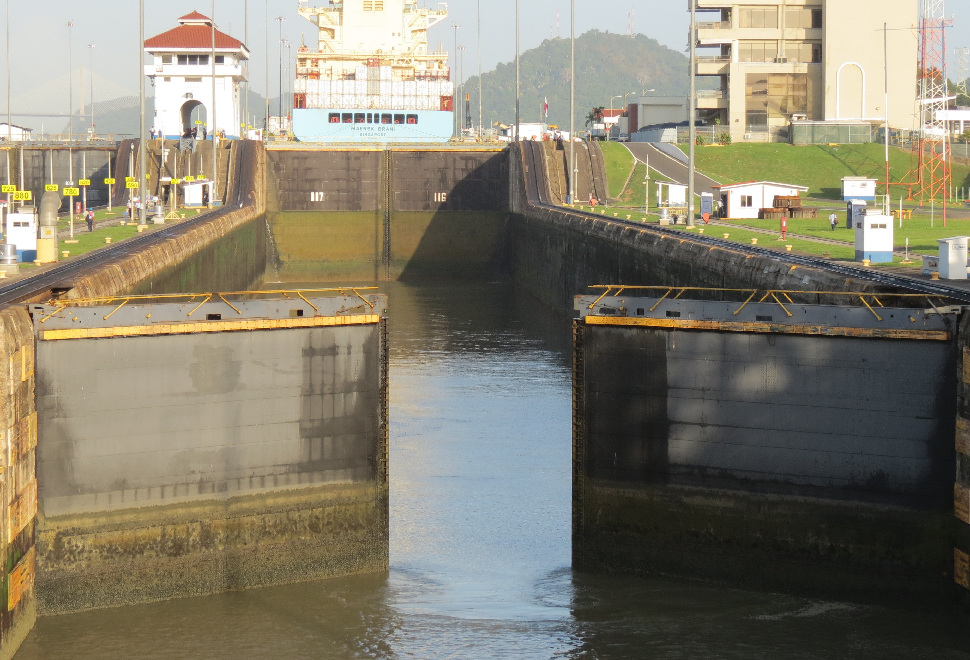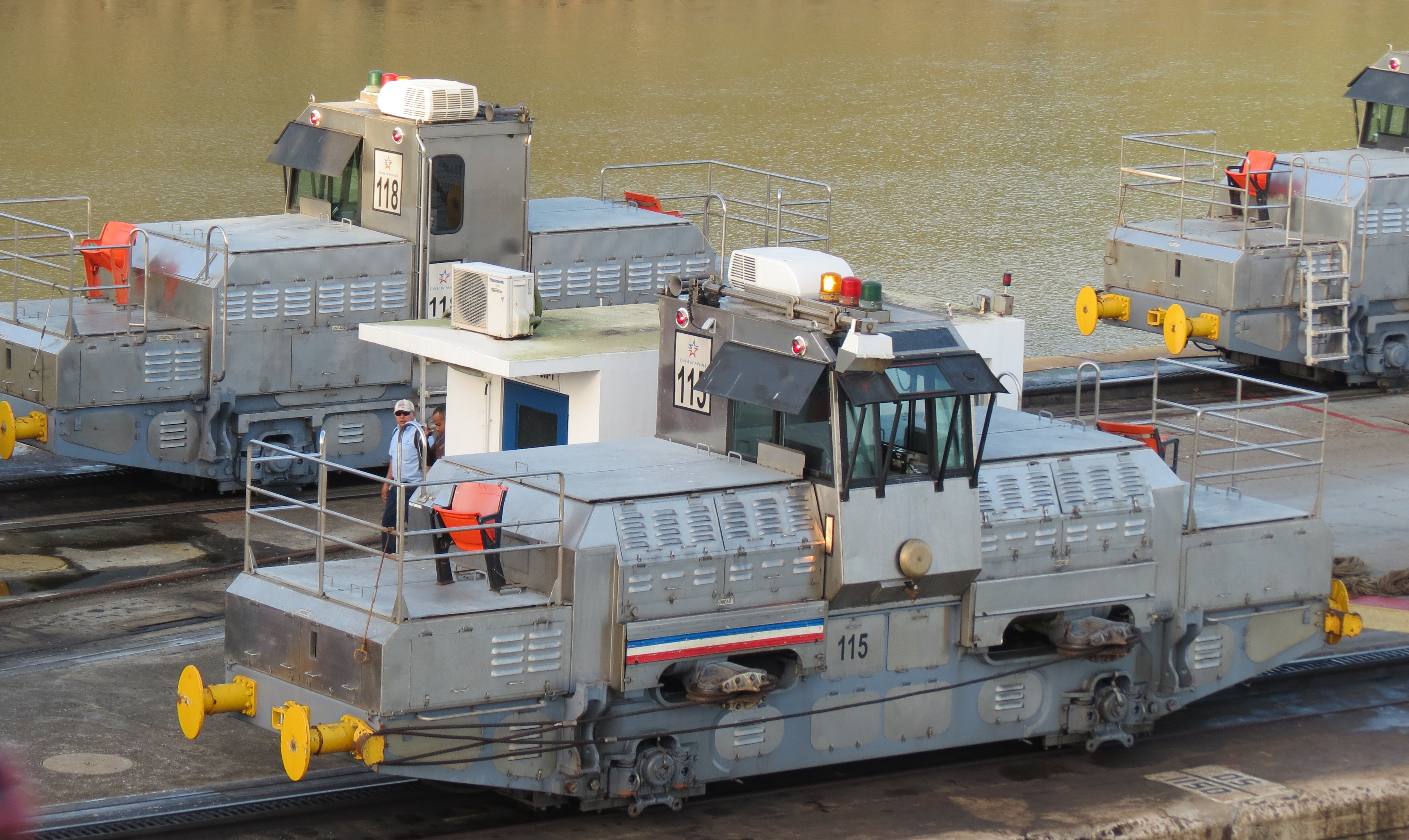 These locomotives called mules are attached to the ship and the tension of the lines keeps the ship in the center of the lock and away from the sides. We only had about 1 meter of spare room on each side.
