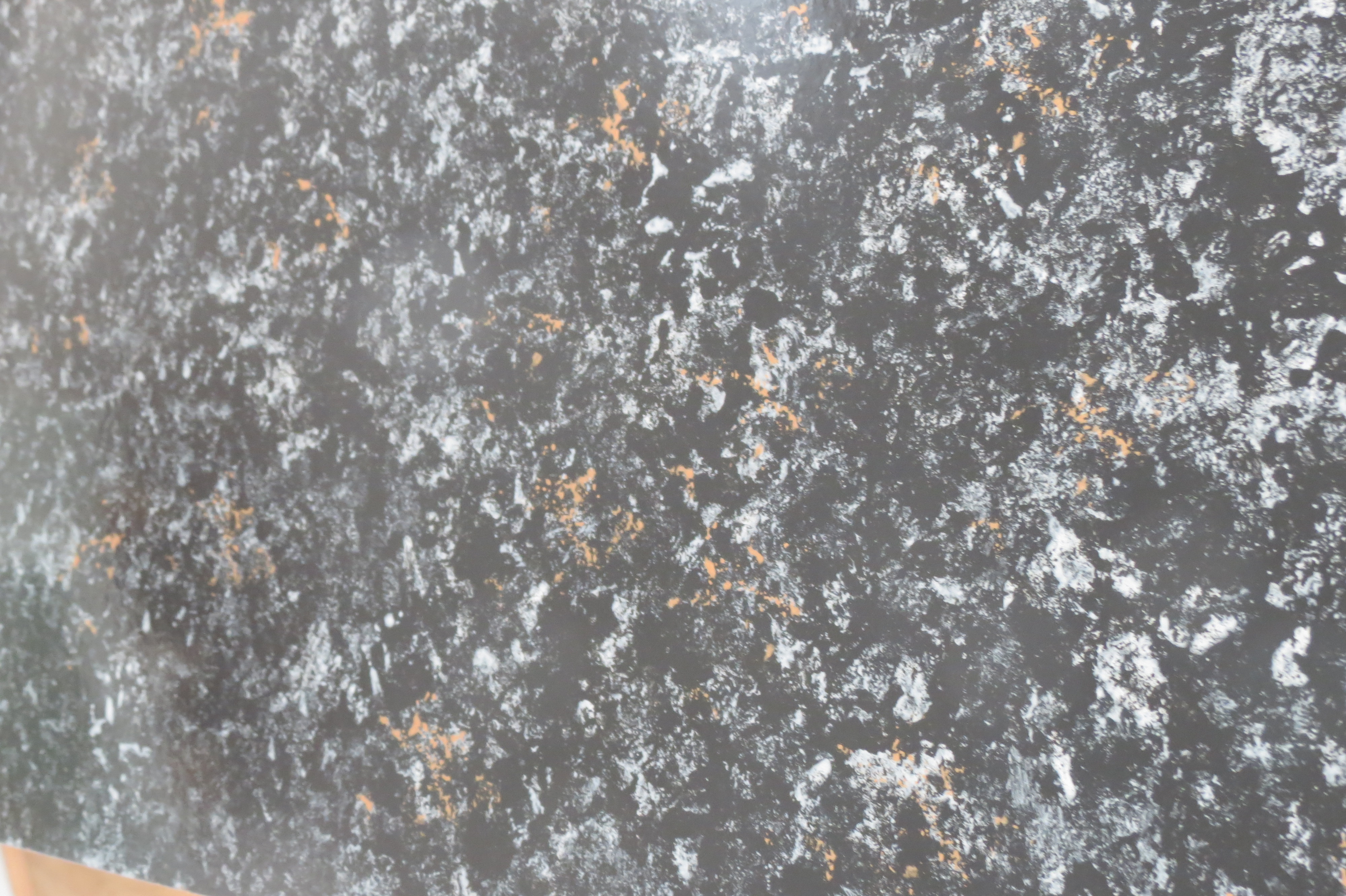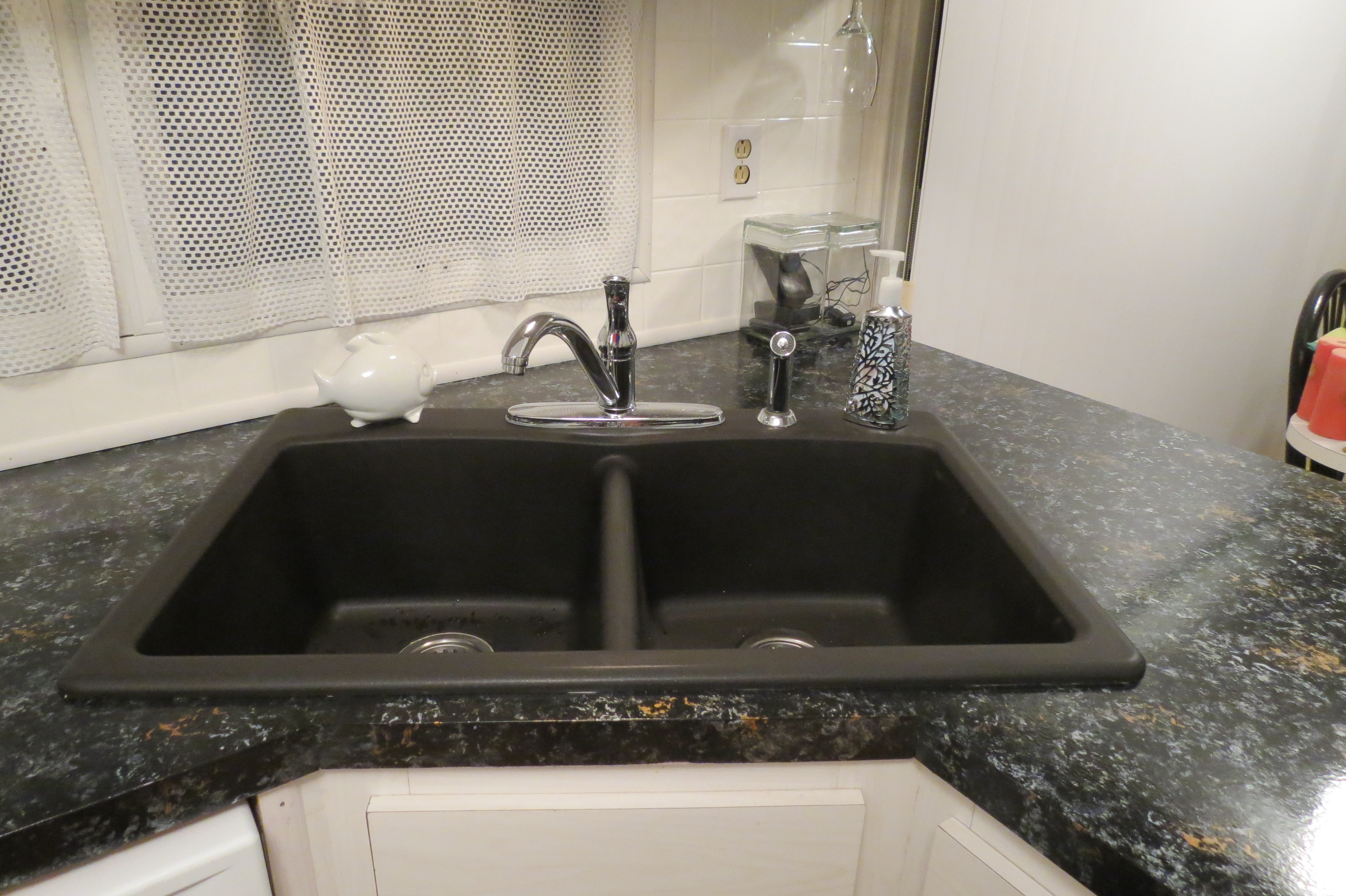 The transformation from ugly took several days. The counters were cleaned and then painted with a 5 step kit. Coat one was painting all countertops flat black with a roller, followed by three layers of metallic paint (silver, black, bronze) each applied with a large natural sea sponge. I daubed the entire surface with splashes of the silver first then the others. The last step was 3 layers of sealant. The finish is quite good – supposed to look like granite.