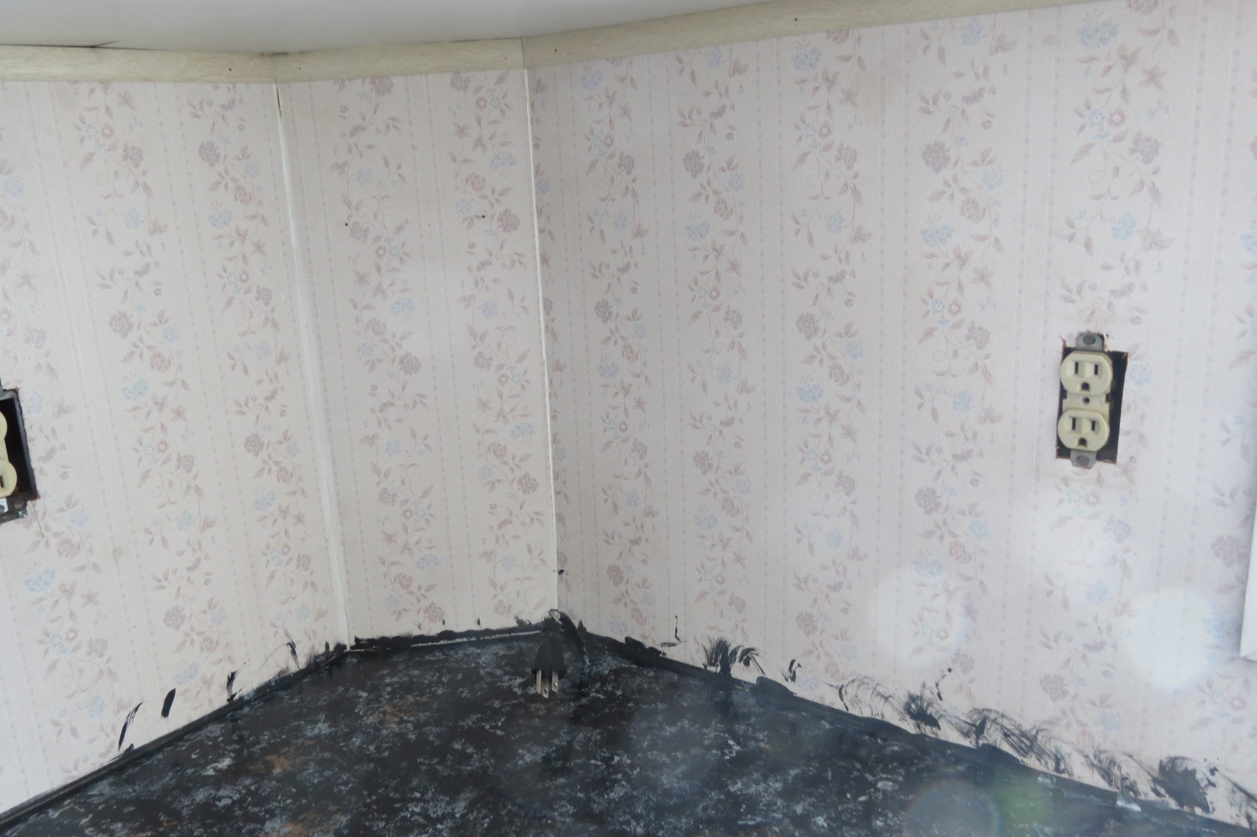The awful wallpaper got covered with a white tile board that is very easy to clean. It actually made the space look larger.