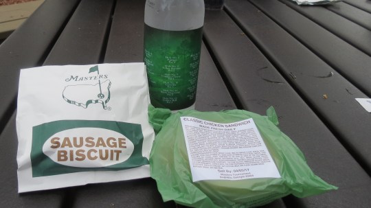 This was breakfast – Dave had coffee and a breakfast sandwich, I had the chicken sandwich and water. The whole thing only cost $8. The Masters is one of the only places I have ever been where the concession items are cheap.
