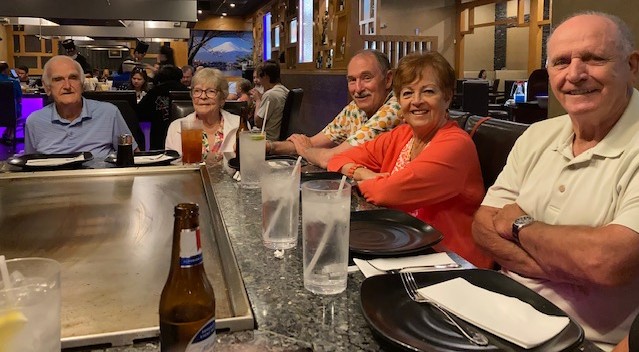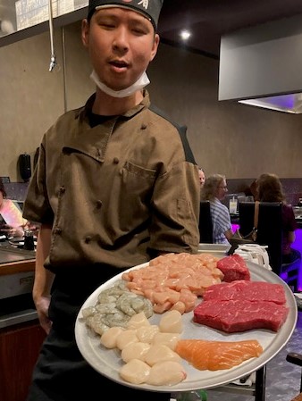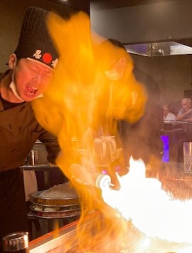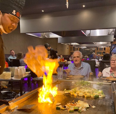 Last night the nine of us tried something new for our Friday night food outing. We usually hit one of our favourite places but we thought we would try Kendo out. We enjoyed our chef who was funny, very loud, talented with the knives and generally entertaining. The meal was delicious starting with an Asian green salad with ginger dressing and followed by 2 fried dumplings and edamame. After that we watched lots of slicing and dicing as well as towers of flame. Dave and I each ordered steak and shrimp which was cooked on the grill in front of us along with everyone meal. There was lots of laughter, attempts to catch pieces of broccoli tossed into mouths and squirts of sake. I had forgotten to take my camera so thanks Dan Thornham for stepping up with your phone camera to save the day.