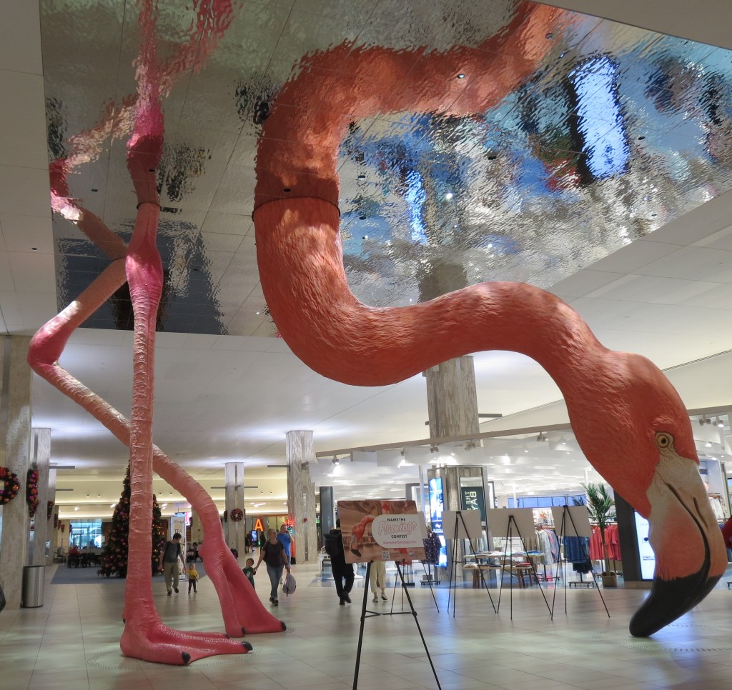 We want to wish all our family and friends a Happy New Year – may 2023 find peace and good health for all. On December 16 we flew home to Nova Scotia for Christmas on a super Air Canada direct flight – the only way to travel. It is unusual to find a direct flight so we were very pleased to come home without the hassle of a stop in Toronto. Christmas was relaxing and we got to have several great family gatherings. As well we spent time with our Friday group and even hosted a small New Year’s Eve gathering. On January 4th we flew direct again to Tampa (this time with Liz and Earl Corkery). During the time we were in Florida during November we had heard about the flamingo sculpture called HOME which was installed at the main Tampa terminal building. So when we arrived we were lucky enough to pass by it on our way to get our luggage. We had voted during the naming contest and were delighted to learn that the flamingo’s new name Phoebe is the one we had liked best. A play on Phoenicopterus — the flamingo’s scientific name. ‘Phoebe’ is also a playful alliterative to flamingo and means brilliantly inquisitive.” The $520,000 sculpture depicts the giant bird dipping its head beneath the surface of the water, in an illusion created by metal panels and lighting attached to the ceiling. It is amazing!