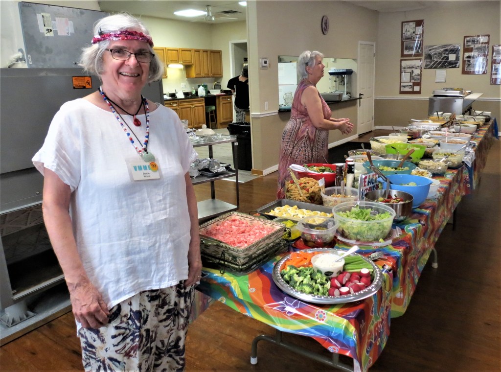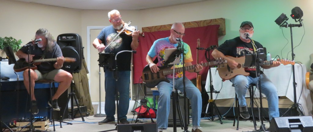 The first gathering since Covid was a 60’s/70’s event at the clubhouse. The organizers provided fried chicken, rolls and pies from Publix (grocery store) and we all brought salads as sides. The band was actually quite good – they played music from that time but after a break they played a sampling of music they were practising for a St. Patty’s Day show – with the fiddler we felt like we were in downtown Halifax. The lead guitarist is a guy who lives in the park. The band is made up of snowbirds who actually met each other at open mike gigs here in town and then formed a “winter time” band.