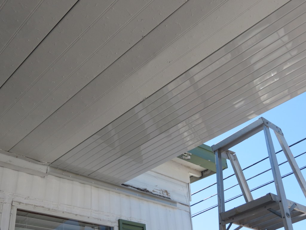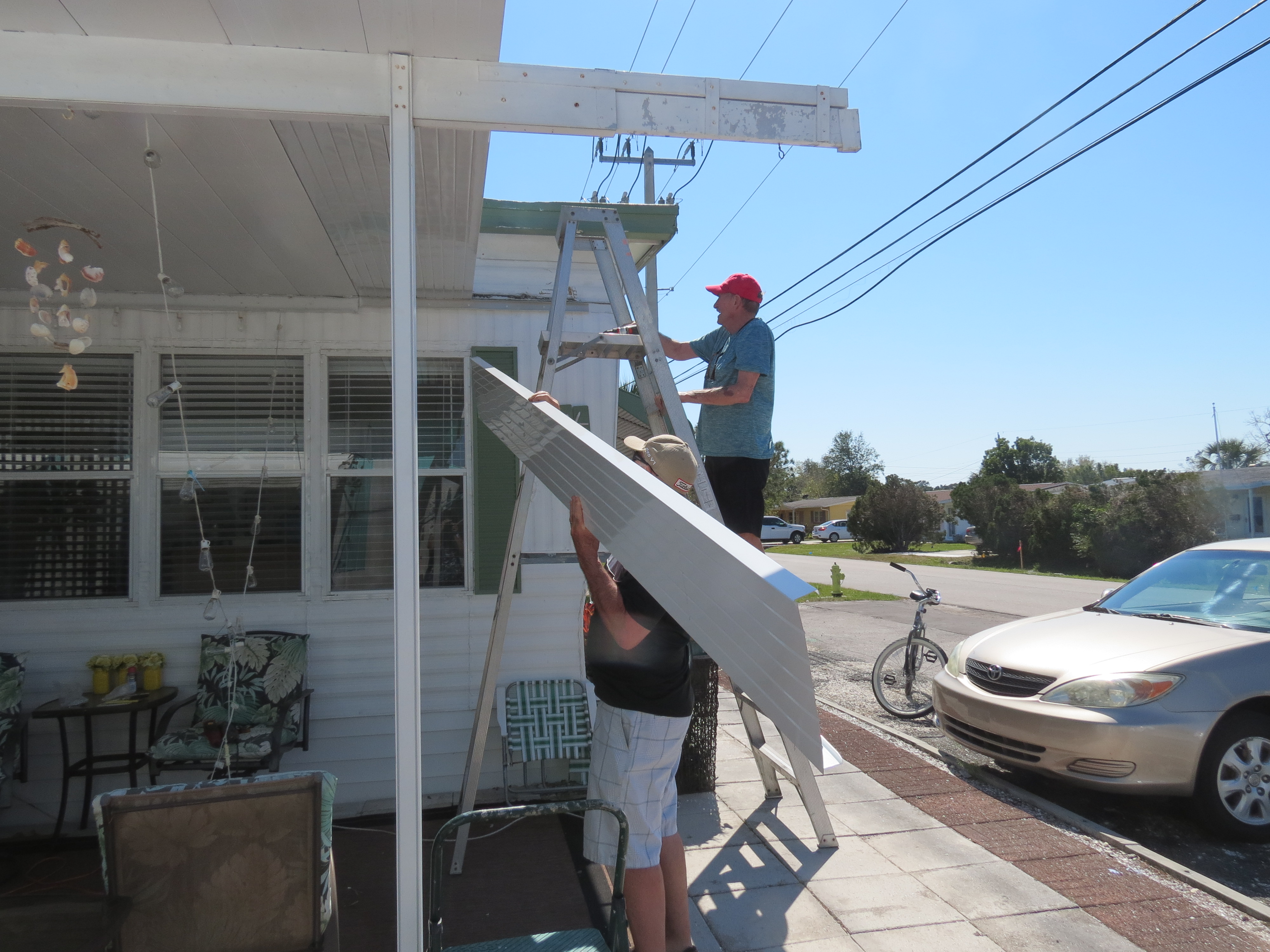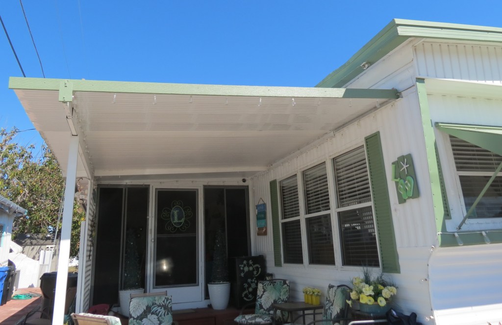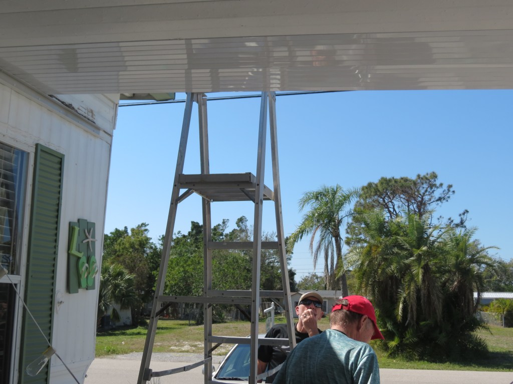 Hurricane Ian was a very destructive storm and when we arrived here mid November things were far from ok. While the major damage was south of us, 4 trailers in our park were destroyed, many lost roofs, and even more lost lanai and carport structures. As Dave and I biked around the park we noticed more and more damage. Along with our Nova Scotia friends we were very lucky to have had minimal damage. We lost the last 2 one foot panels on our carport and two adjacent ones were badly mutilated. So we knew we were going to have to replace the 4 feet and the gutters and end caps. We ordered the panels in November and were told that they would take as long as 4 months to get here. They in fact took 3.5 months and were installed by Dave with help from Earl and me (holding the ladder). We were very blessed that it was such an easy fix as many people still have blue tarped roofs and missing carports, overhangs and lanais.