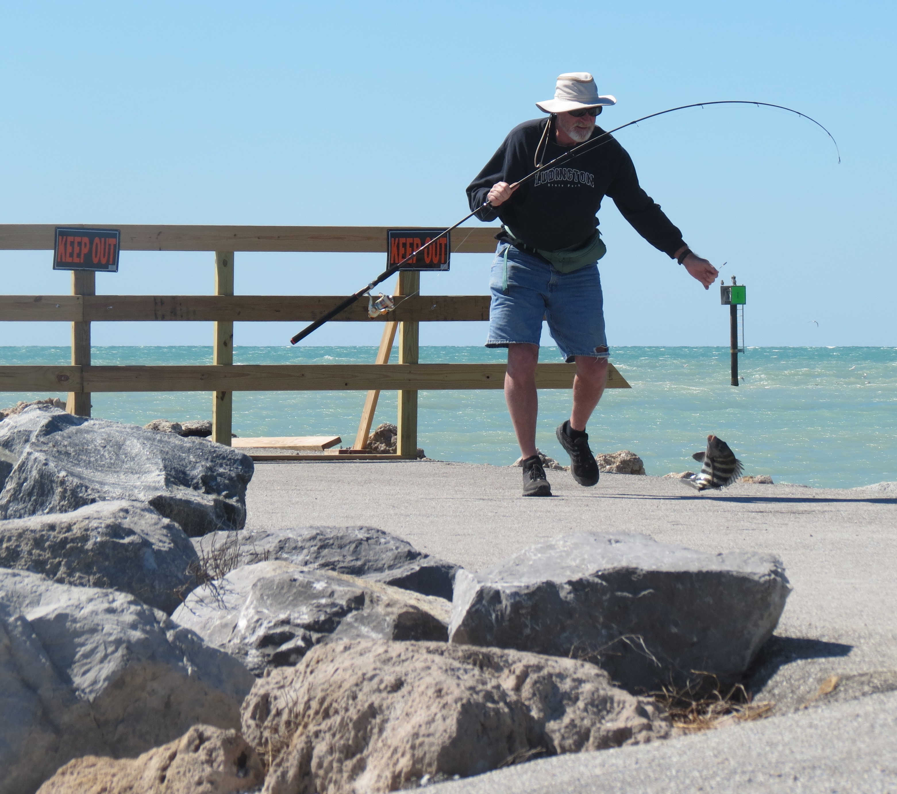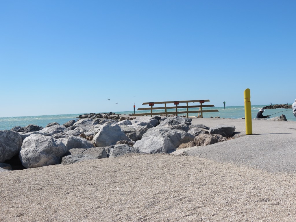 One of our favourite places to spend an hour is the south jetty. Its location means that it bears the brunt of storms and is often damaged. A city news release noted that while the parking lot and Jetty Jack’s concession stand have reopened, the South Jetty walkway is still closed because of damage caused by Hurricane Idalia. The U.S Army Corps of Engineers is scheduled to transport rocks to the site and begin work on the project in 2024. We visited the parking lot and took a few pics today.